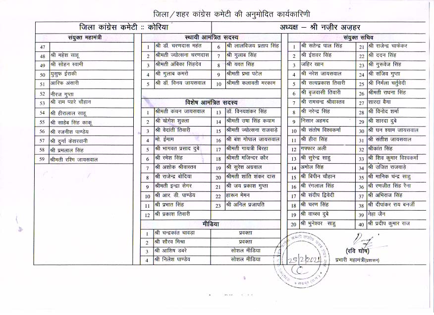 कोरिया जिला कांग्रेस कमेटी कार्यकारिणी