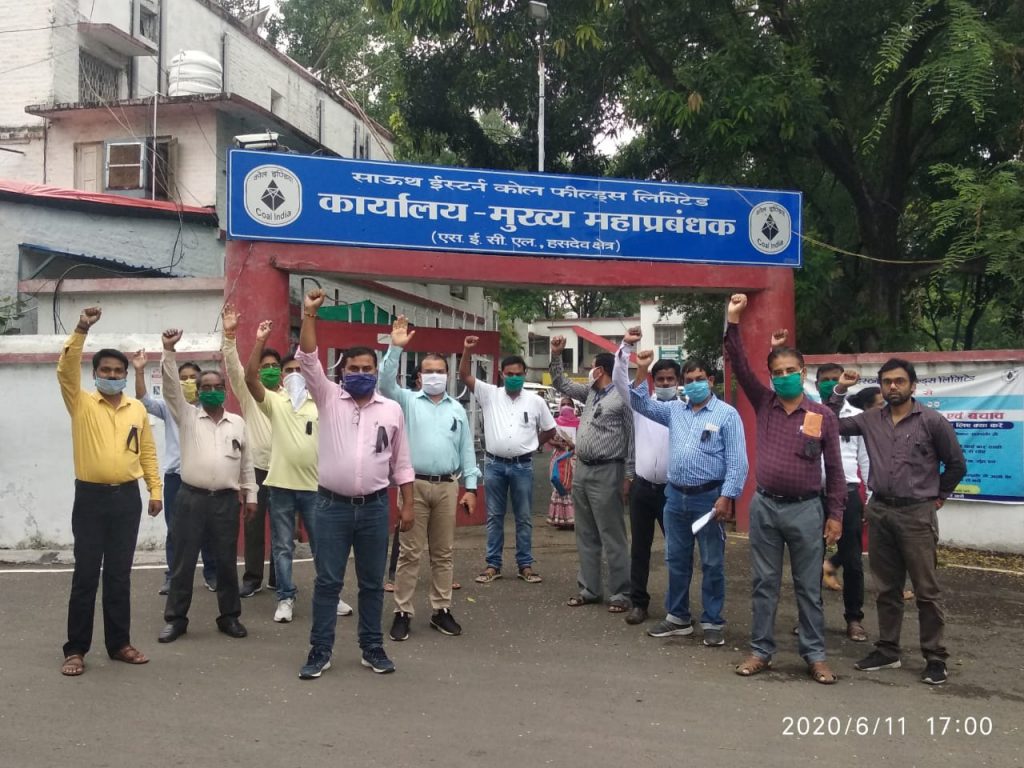 मनेन्द्रगढ़ 11/06/2020 केंद्रीय श्रम संगठनों के आह्वान पर 10 व 11 जून को दो दिवसीय देशव्यापी विरोध दिवस मनाने की कड़ी में हसदेव क्षेत्र के जी.एम.ऑफिस, क्षेत्रीय महाप्रबंधक कार्यालय पर आज दिनांक 11-06-2020 को भारत सरकार के उद्योग विरोधी एवं मजदूर विरोधी फैसलों कोयला उद्योग का निजीकरण, कामर्शियल माइनिंग, निजी क्षेत्रों को कोल ब्लॉक आवंटन, सीएमपीडीआई को कोल इंडिया से अलग करने, श्रम कानूनों में मजदूर विरोधी संशोधन इत्यादि निर्णयों के खिलाफ एटक एवं एचएमएस यूनियन के तत्वाधान में जी.एम.ऑफिस के कर्मचारियों के द्वारा काला फ़ीता लगाकर विरोध प्रदर्शन किया गया |