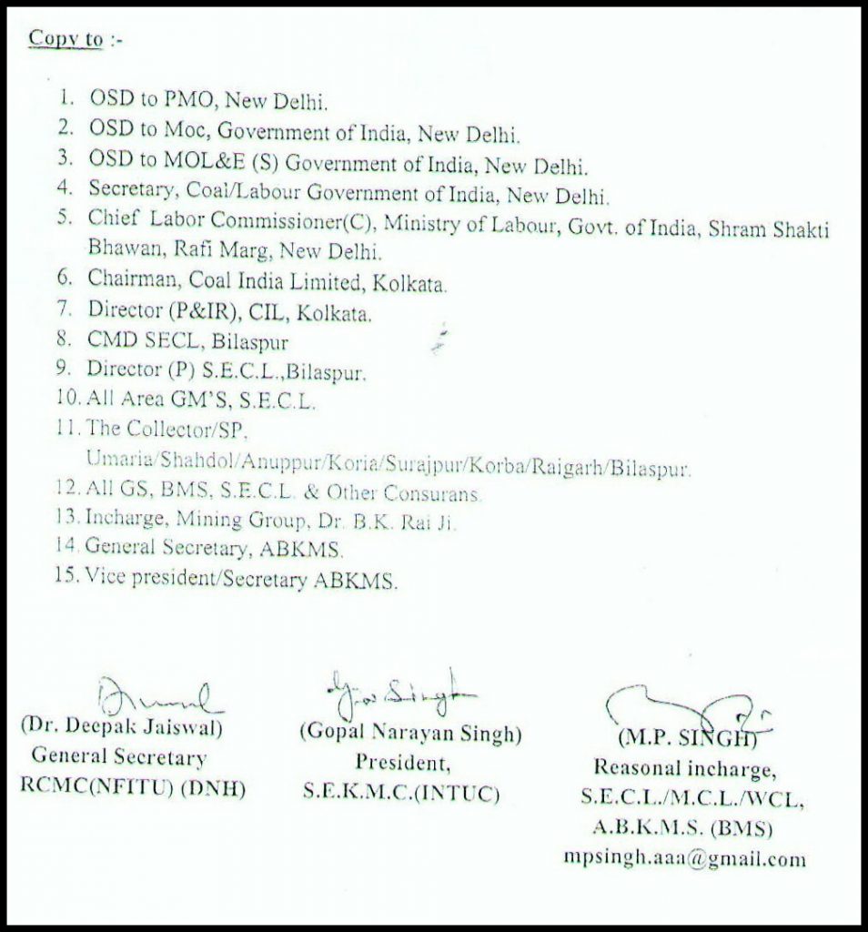 बिलासपुर 18 जून 2020 कामर्शियल माइनिंग के फैसले के विरोध में 2 से 4 जुलाई को एसईसीएल सहित कोल इंडिया में तीन दिवसीय हड़ताल होगी। महेन्द्र प्रताप सिंह भारतीय मजदूर संघ (प्रभारी) , डॉ. दीपक जायसवाल एनएफआईटीयू के राष्ट्रीय अध्यक्ष, गोपाल नारायण सिंह एसईकेएमसी ने आज कोयला सचिव को एक हड़ताल नोटिस एसईसीएल मुख्यालय बिलासपुर में संयुक्त रुप से निर्देशक कार्मिक एवं महाप्रबंधक ए.सक्सेना को सौपा,और अनुरोध किया है कि संगठनों के मांगों के समर्थन में की जारी हड़ताल को कोल इंडिया एवं कोयला सचिव को अग्रसित कर देवें भारतीय मजदूर संघ एवं अन्य संगठनों द्वारा दिए गए हड़ताल में प्रमुख मांग सरकार द्वारा कामर्शियल माइनिंग के निर्णय को वापिस लेने सीआईएल एवं एससीएल को रोकने कोल इंडिया से सीएमपीडीआई कंपनी को अलग करने एसईसीएल सहित कोल इंडिया की खदानों में ठेकेदारी मजदूर के रूप में काम करने वाले कामगारों को एचपीसी कमेटी की रिपोर्ट के अनुसार वेतन व अन्य सुविधा दिलाने संबंधि एग्रीमेंट को लागु करने तथा राष्ट्रीय कोयला वेतन समझौता की धारा 9.3.0/9.4.0/9.5.0 के तहत अनफिट कामगारों के आश्रितों को नौकरी देने संबंधि प्रावधान को लागु करने संबंधित कई मांगो प्रेषित की गई है।