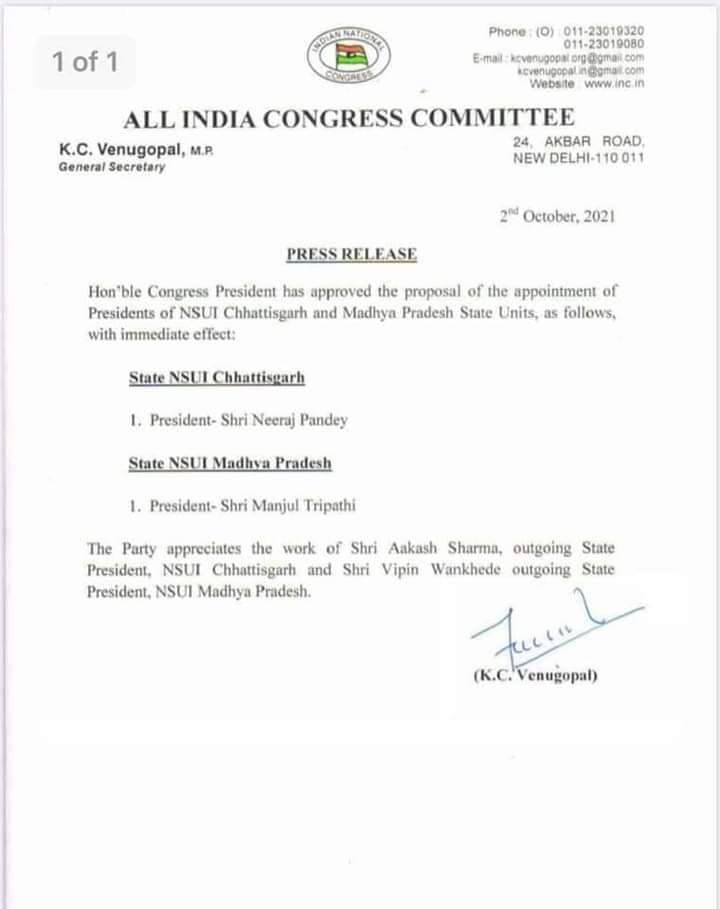इसी कडी में मध्यप्रदेश एनएसयूआई के प्रदेश अध्यक्ष की जिम्मेदारी मंजुल त्रिपाठी को दी गई और छत्तीसगढ़ एनएसयूआई के प्रदेश अध्यक्ष का पद नीरज पांडे के सुपुर्द किया गया। मध्यप्रदेश से छत्तीसगढ़ राज्य बनने के बाद पहली बार कोरिया जिले से एमसीबी जिले के रूप में अलग होकर घोषित हुए क्षेत्र के खोंगापानी नगर पंचायत के रहने वाले नीरज पांडे को जिम्मेदारी मिलने क्षेत्र के युवाओं में खुशी लहर दौड़ गई। जानकारी के अनुसार नीरज के पिता यमुना प्रसाद शास्त्री उ.मा. विद्यालय खोंगापानी में शिक्षक का कर्तव्य निभाते हैं। इधर प्रदेश के मुख्यमंत्री भूपेश बघेल और प्रदेश के स्वास्थ्य मंत्री टीएस सिंहदेव ने भी नीरज पांडे के एनएसयूआई प्रदेशाध्यक्ष नियुक्त होने पर बधाई प्रेषित की।