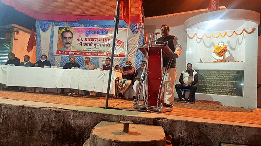 कार्यक्रम की अध्यक्षता कर रहे कामरेड हरिद्वार सिंह ने कहा कि कामरेड मारकण्डेय सिंह हम सभी के अभिभावक थे। हसदेव क्षेत्र को विकास के मंजिल तक पहुंचाना ही कामरेड मारकण्डेय सिंह को सही श्रद्धांजलि होगी। उन्होंने कहा भारत सरकार कोयला उद्योग को बदनाम कर निजी क्षेत्र को बढ़ावा देना चाह रही है। हमें डटकर मुकाबला करना है, 23 और 24 फरवरी मुकम्मल हड़ताल कर कोयला उद्योग को बचाना है। भारत सरकार सार्वजनिक क्षेत्र का बिक्री करना चाहती है। संघर्ष और सार्वजनिक क्षेत्र की रक्षा करना भी कामरेड मारकंडेय सिंह के सोच का हिस्सा था। हम सभी यूनियन के लोग मिलकर के संघर्ष के रास्ते पर चल कर कोयला उद्योग को बचाएंगे। उन्होंने कहा कि एटक संगठन निरंतर मजदूर हित में कार्य कर रहा है। कोरोना काल में एटक के कार्यकर्ताओं ने समूचे एसईसीएल में मजदूरों का भरपूर साथ दिया। कामरेड हरिद्वार सिंह ने बताया कि उन्होंने खुद एसईसीएल के विभिन्न क्षेत्रों के लगभग 70 से अधिक कोविड मरीजों को बिलासपुर एवं रायपुर के अस्पतालों में बेड सहित अन्य सुविधाएं मुहैया कराया है। श्रमिकों के ज्वलंत सवालों को संगठन ने एसईसीएल के सभी फोरम पर उठाया है।