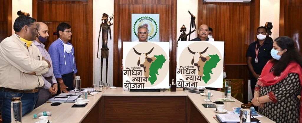 रायपुर, 17 जुलाई 2020। मुख्यमंत्री भूपेश बघेल और कृषि एवं जल संसाधन मंत्री रविन्द्र चौबे ने आज यहां मुख्यमंत्री निवास कार्यालय में वीडियो कॉन्फ्रेंसिंग के माध्यम से आयोजित कलेक्टर्स कान्फ्रेंस के दौरान छत्तीसगढ़ सरकार की महत्वाकांक्षी ‘गोधन न्याय योजना‘ के प्रतीक चिन्ह (लोगो) का विमोचन किया। राज्य सरकार द्वारा हरेली पर्व से प्रदेश में गोधन न्याय योजना की शुरूआत की जा रही है। इस अवसर पर मुख्य सचिव आर पी मंडल, मुख्यमंत्री के अपर मुख्य सचिव सुब्रत साहू, कृषि उत्पादन आयुक्त डॉ. एम. गीता, मुख्यमंत्री के ग्रामीण विकास सलाहकार प्रदीप शर्मा, मुख्यमंत्री के संसदीय सलाहकार राजेश तिवारी उपस्थित थे।