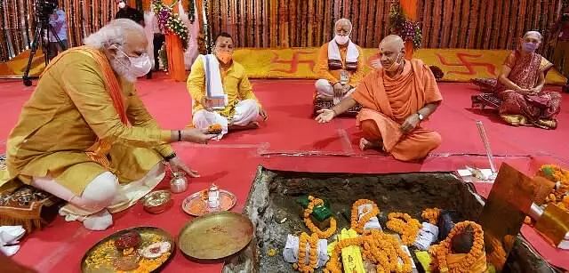 राम मंदिर निर्माण के लिए पहले शिलाओं का पूजन किया गया। 12 बज कर 44 मिनट पर चांदी की कन्नी से नींव डाली गई। पूजा स्थल पर मुख्यमंत्री योगी, राज्यपाल आनंदीबेन पटेल, संघ प्रमुख मोहन भागवत और नृत्य गोपाल दास मौजूद रहे। प्रधानमंत्री नरेंद्र मोदी ने हर काम समय से पूरा किया। जबकि पंडित जी पूजा बढ़ा रहे थे, क्योंकि अगला मुहूर्त 12 बजकर 44 मिनट 8 सेकंड पर था।