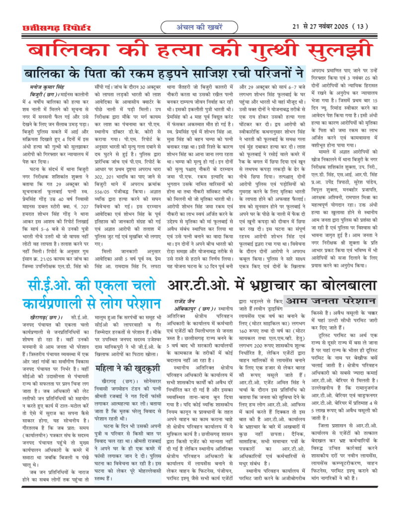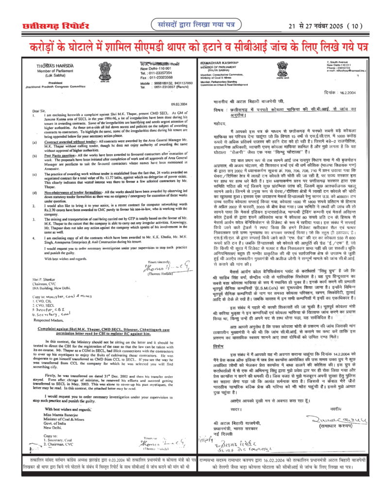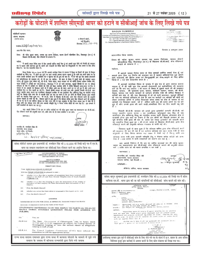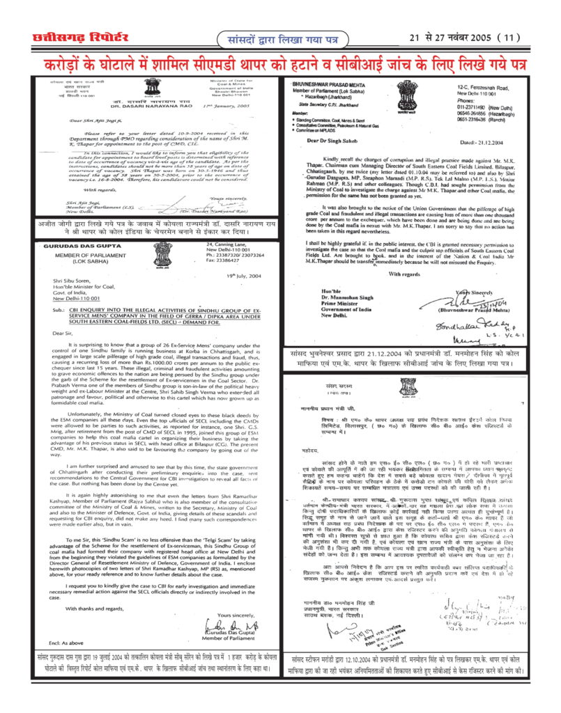 ‘‘छत्तीसगढ़ रिपोर्टर’’ ने 21 से 27 नवंबर 2005 के अंक में ‘‘एस.ई.सी.एल के अरबों के कोयला घोटाले में सरकार की भूमिका संदिग्ध’’ कोयला के खेल में बड़े-बड़े राजनेताओं के हाथ कालेे के शीर्षक से आठवांबड़ा खुलासा किया था। जिसमेें एसईसीएल में 15 सालों से बड़े पैमाने पर हो रहे कोयला घोटाले के बारे में लिखा जाए तो कई ‘पोथियां’ भी कम पड़ जाएंगी। यहां सारे कानून को धता बताकर सरकार को अरबों का चूना लगाने का काम बखूबी चल रहा है। इनके खिलाफ आवाज तो उठ रही है लेकिन उसे भी दबा दिया जाता है। जिस तरह से यहां अंधेरगर्दी मची हुई है वह अपने आप में हैरान करने वाली बात है। अरबों के इस खेल में बड़े-बड़ेे राजनीतिज्ञों, व्यापारियों एवं कोल माफियाओं द्वारा किस तरह निकाला जा रहा है देश का तेल? भ्रष्ट अधिकारी एवं कोल माफिया किस प्रकार नियंत्रण रखते हैं देश के कोयला मंत्री पर? फटाफट क्यों बदल जाते हैं कोयला मंत्री? कैसे मिलीभगत रहती है इनकी,‘‘छत्तीसगढ़ रिपोर्टर’’ ने 19 से 24 अप्रैल 2004 के अंक में ‘‘एस.ई.सी.एल में प्रति वर्ष 10 अरब का कोयला घोटाला, सिलसिला वर्षों से जारी’’ के शीर्षक से प्रथम खुलासा किया था तथा लगातार खुलासा जारी रखा। इसके बाद विभिन्न राष्ट्रीय पार्टी के दर्जन भर से अधिक सांसदों ने जिनमें सांसद रामाधार कश्यप, सांसद थामस हसंदा, सांसद गुरुदास दास गुप्ता, सांसद स्टीफन मंडावी, सांसद बी.पी. मेहता, सांसद मोतीउर्र रहमान, सांसद बागुन सुम्बरूई, सांसद भुवनेश्वर प्रसाद मेहता, सांसद चन्द्रशेखर दुबे, आदि ने प्रधानमंत्री डॉ. मनमोहन सिंह, कोयला मंत्री एवं सी.बी.आई को अलग-अलग पत्र लिखकर कहा था कि एस.ई.सी.एल बिलासपुर छत्तीसगढ़ के सी.एम.डी. एवं चर्चित कोल माफिया व भ्रष्ट अधिकारियों द्वारा सालाना 10 अरब का कोयला घोटाला किया जा रहा है और यह सिलसिला 15 वर्षों से जारी है जिस पर शीघ्र कार्यवाही करने की मांग की थी, उन सभी सांसदों का पत्र ‘‘छत्तीसगढ़ रिपोर्टर’’ के पास उपलब्ध है और उसे प्रकाशित भी किया था। इस मामले को कांग्रेस नेता व पूर्व केन्द्रीय मंत्री कपिल सिब्बल ने भी नई दिल्ली में प्रेस कान्फ्रेंस कर एसईसीएल के इस घोटाले को उठाया और अटल सरकार पर गंभीर आरोप लगाए थे। छत्तीसगढ़ के तत्कालीन मुख्यमंत्री अजीत जोगी ने भी सम्पूर्ण मामले की सी.बी.आई से जांच कराने के लिए केन्द्र सरकार को पत्र लिखा था। तत्कालीन भाजपा विधायक व छत्तीसगढ़ शासन के केबिनेट मंत्री बृजमोहन अग्रवाल ने भी इस मामले को विधानसभा में उठाया था। कोयला सचिव, पी.सी. पारेख ने भी सी.बी.आई के डायरेक्टर यू.एस.मिश्रा को पत्र लिखकर एस.ई.सी.एल के घोटाले की उच्चस्तरीय जांच के लिए कहा था। कोल इंडिया के मुख्य सर्तकता अधिकारी शशिप्रकाश ने भी कोयला सचिव को भेजे रिपोर्ट में घोटाले क