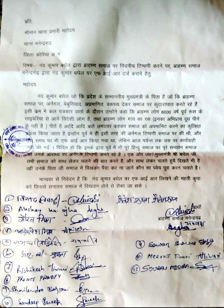इसी तरह नंद कमार बघेल के द्वारा मीडिया में दिए गए वक्तव्य की वजह से ब्राहमण समाज ने भी थाने में ज्ञापन देकर इनके खिलाफ एफआईआर दर्ज करने की मांग की। बता दें कि रेस्ट हाउस मनेन्द्रगढ़ में नंद कुमार बघेल ने मीडिया से कहा कि कुर्मी अन्न पैदा करने का काम करते हैं। सारे कुर्मी की कहीं न कहीं भूमि से जुडे है। हम सारे कुर्मियों को संगठित कर उनका राज स्थापित करना चाहते हैं। और ब्राहमणों के लिए इन्होने कहा कि पंडित हमको अछूत मानते हैं और हमको पंडितों का पैर छूना पड़ता है छह हजार साल पहले पंडित यहां रूस और साइबेरिया से आए हैं। ये दूध नही पीते हैं बल्कि गाय का रस पीते हैं और गाय का रस पीने वालों से हम नफरत करते हैं। इसी निंदनीय बयानबाजी को लेकर ब्राहमण समाज ने रविवार को इनके ऊपर एफआईआर दर्ज करने की मांग की।