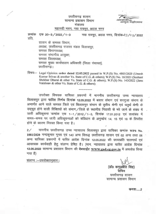इस पत्राचार में कहा गया है, छत्तीसगढ़ हाईकोर्ट की ओर से पारित निर्णय दिनांक 12-5-2022 में बस्तर संभाग और सरगुजा संभाग के अंतर्गत आने वाले सभी जिलों और बिलासपुर संभाग के तृतीय श्रेणी और चतुर्थ श्रेणी की रिक्तियों को संभाग/जिलों के स्थानीय निवासियों से भरे जाने के संबंध में जारी अधिसूचनाओं को संविधान के अनुच्छेद 14, 15 और 16 के विपरीत होने की वजह से निरस्त किया गया है। मामले में पारित आदेश की छायाप्रति पालन और आवश्यक कार्यवाही के लिए प्रेषित है।