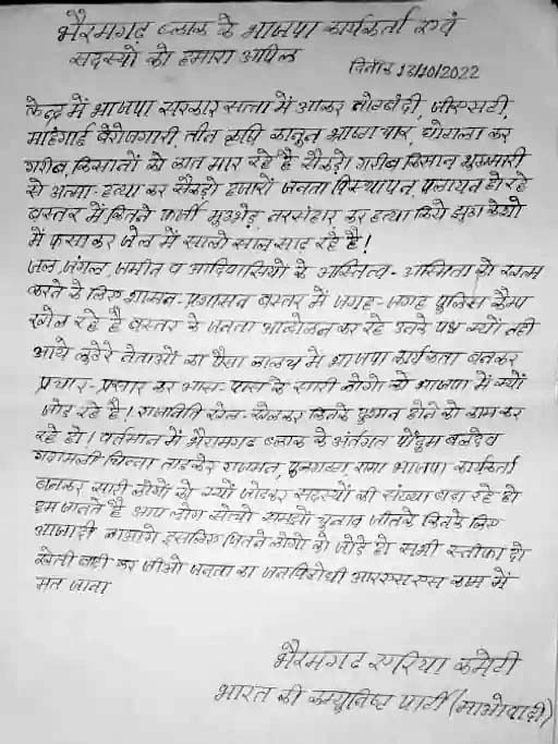भैरमगढ़ एरिया कमेटी की तरफ से जारी किए गए पर्चे में लिखा है कि, केंद्र में भाजपा की सरकार आने के बाद नोटबंदी, जीएसटी, महंगाई, बेरोजगारी, कृषि कानून लाकर किसानों को परेशान किया गया है। यही वजह है कि किसान आत्महत्या कर रहे हैं। बस्तर में कई पुलिस-नक्सली झूठी मुठभेड़ हुई है। कई ग्रामीणों को नक्सली बताकर फर्जी केस में जेल में डाल दिया गया है।