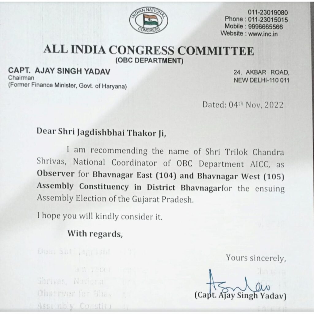 बिलासपुर 13 नवंबर 2022। कांग्रेस नेता त्रिलोक चंद्र श्रीवास, राष्ट्रीय समन्वयक, अखिल भारतीय कांग्रेस कमेटी, पि. व. विभाग, प्रभारी, प्रदेश कांग्रेस कमेटी, बिहार, को गुजरात विधानसभा चुनाव हेतु अखिल भारतीय कमेटी के राष्ट्रीय महासचिव के.सी.वेणुगोपाल एवं पिछड़ा वर्ग विभाग कांग्रेस के राष्ट्रीय अध्यक्ष कैप्टन अजय सिंह यादव के द्वारा जैतपुर विधानसभा, भावनगर पूर्व विधानसभा, भावनगर पश्चिम विधानसभा, हेतु प्रभारी- पर्यवेक्षक नियुक्त किया गया है, विदित हो कि भावनगर सीट से ही पूर्व में शक्ति सिंह गोहिल जो कांग्रेस के राष्ट्रीय नेता हैं,वे विधायक रहे ,वह गुजरात में सीएम के फेस भी हैं, उक्त महत्वपूर्ण सीट पर कांग्रेस पार्टी ने प्रभारी पर्यवेक्षक बनाकर महत्वपूर्ण जिम्मेदारी दी है, पूर्व में त्रिलोक चंद्र श्रीवास उत्तर प्रदेश चुनाव में भी 1 महीने रह कर अपने सहयोगियों सहित वहां प्रचार प्रसार किए थे, बिहार विधानसभा चुनाव में भी इन्होंने पार्टी के पक्ष में प्रचार कार्य किया था, कई राज्यों में पार्टी के पक्ष में प्रचार कार्य कर चुके हैं।
