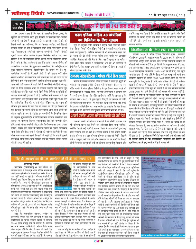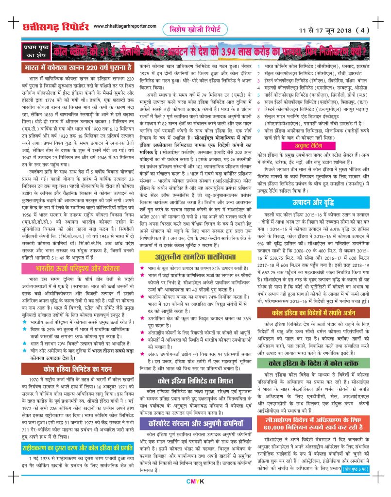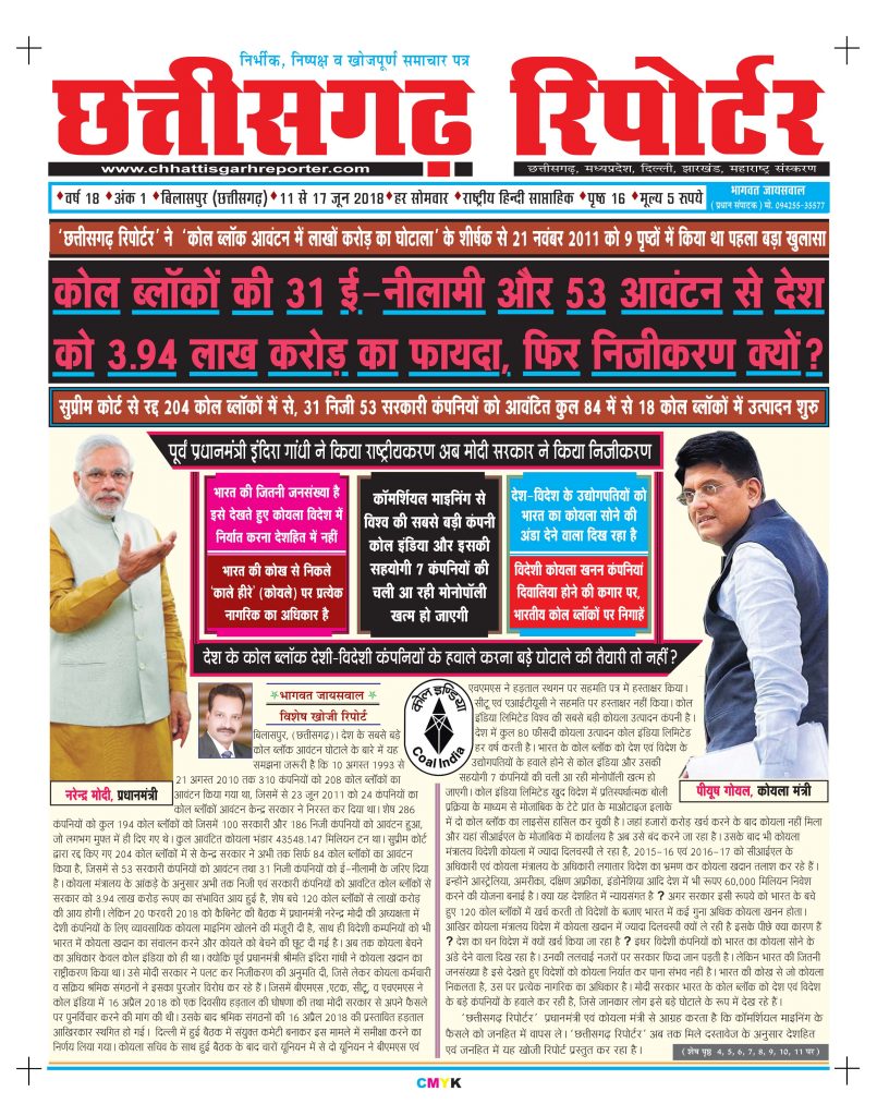 ‘छत्तीसगढ़ रिपोर्टर’ ने 11 से 17 जून 2018 के अंक में ‘कोल ब्लॉकों की 31 ई–नीलामी और 53 आवंटन से देश को 3.94 लाख करोड़ का फायदा, फिर निजीकरण क्यों?’ के शीर्षक से 9 पृष्ठों में खुलासा किया था। जिस कोयला घोटाले को लेकर पूरे देश में कोहराम मचा, उसका सर्वप्रथम खुलासा ‘‘छत्तीसगढ़ रिपोर्टर’’ ने 21 से 27 नवंबर 2011 के अंक में ‘‘कोल ब्लॉक आवंटन में लाखों करोड़ का घोटाला’’ के शीर्षक से किया था। देश के सबसे बड़े कोल ब्लॉक आवंटन घोटाले के बारे में यह समझना जरूरी है कि 10 अगस्त 1993 से 21 अगस्त 2010 तक 310 कंपनियों को 214 कोल ब्लॉकों का आवंटन किया गया था, जिसमें से 23 जून 2011 को 24 कंपनियों का कोल ब्लॉकों आवंटन केन्द्र सरकार ने निरस्त कर दिया था। शेष 286 कंपनियों को कुल 194 कोल ब्लॉकों को जिसमें 100 सरकारी और 186 निजी कंपनियों को आवंटन हुआ था , जो लगभग मुफ्त में ही दिया गया था। कुल आवंटित कोयला भंडार 43548.147 मिलियन टन था। सुप्रीम कोर्ट द्वारा रद्द किए गए 204 कोल ब्लॉकों में से केन्द्र सरकार ने अभी तक सिर्फ 84 कोल ब्लॉकों का आवंटन किया था, जिसमें से 53 सरकारी कंपनियों को आवंटन तथा 31 निजी कंपनियों को ई-नीलामी के जरिए दिया गया था। कोयला मंत्रालय के आंकड़े के अनुसार अभी तक निजी एवं सरकारी कंपनियों को आवंटित कोल ब्लॉकों से सरकार को 3.94 लाख करोड़ रुपए की संभावित आय हुई थी, शेष बचे 120 कोल ब्लॉकों से लाखों करोड़ की आय होगी। लेकिन 20 फरवरी 2018 को कैबिनेट की बैठक में प्रधानमंत्री नरेन्द्र मोदी की अध्यक्षता में देशी कंपनियों के लिए व्यावसायिक कोयला माइनिंग खोलने की मंजूरी दी गई थी, साथ ही विदेशी कम्पनियों को भी भारत में कोयला खदान का संचालन करने और कोयले को बेचने की छूट दी गई । अब तक कोयला बेचने का अधिकार केवल कोल इंडिया को ही था क्योंकि पूर्व प्रधानमंत्री श्रीमति इंदिरा गांधी ने कोयला खदान का राष्ट्रीयकरण किया था। उसे मोदी सरकार ने पलट कर निजीकरण की अनुमति दी, जिसे लेकर कोयला कर्मचारी व सक्रिय श्रमिक संगठन इसका पुरजोर विरोध कर रहे थे जिसमें बीएमएस ,एटक, सीटू, व एचएमएस ने कोल इंडिया में 16 अप्रैल 2018 को एक दिवसीय हड़ताल की घोषणा की तथा मोदी सरकार से अपने फैसले पर पुनर्विचार करने की मांग की थी। उसके बाद श्रमिक संगठनों की 16 अप्रैल 2018 की प्रस्तावित हड़ताल आखिरकार स्थगित हो गई। दिल्ली में हुई बैठक में संयुक्त कमेटी बनाकर इस मामले में समीक्षा करने का निर्णय लिया गया। कोयला सचिव के साथ हुई बैठक के बाद चारों यूनियन में से दो यूनियन ने बीएमएस एवं एचएमएस ने हड़ताल स्थगन पर सहमति पत्र में हस्ताक्षर किया। सीटू एवं एआईटीयूसी ने सहमति पर हस्ताक्षर नहीं किया। कोल इंडिया लिमिटेड विश्व की सबसे बड़ी कोयला उत्पादन कंपनी है। देश में कुल 80 फीसदी कोयला उत्पादन कोल इंडिया लिमिटेड हर वर