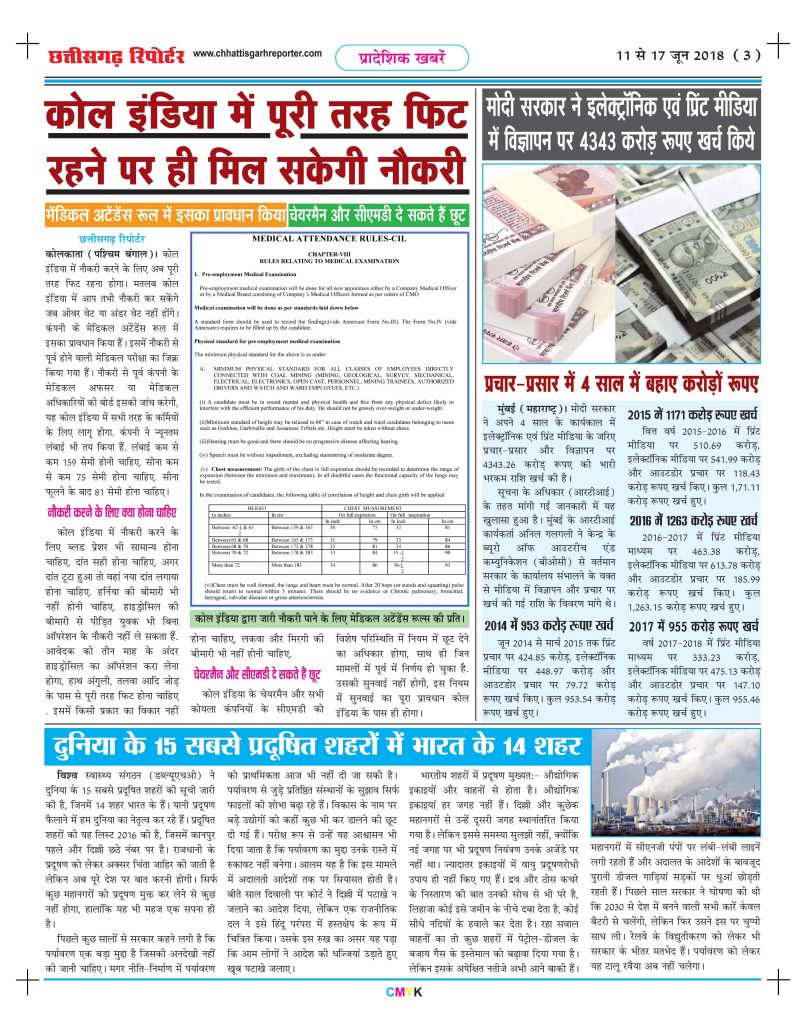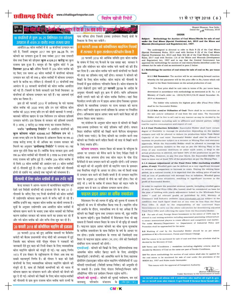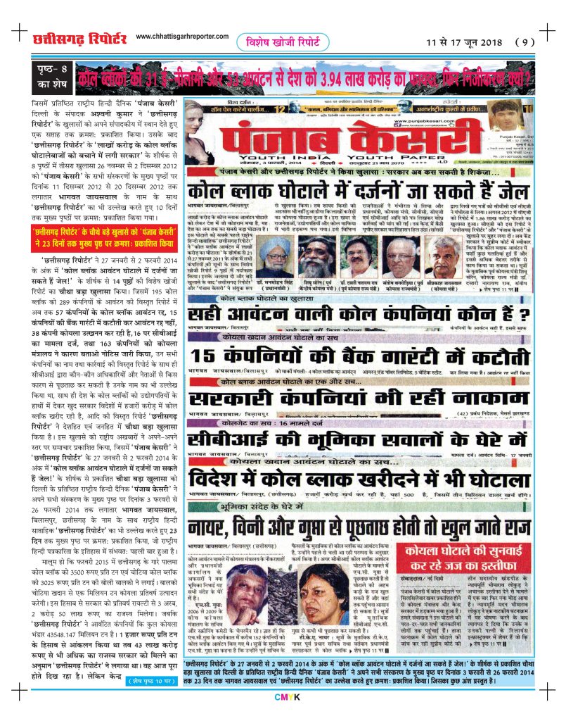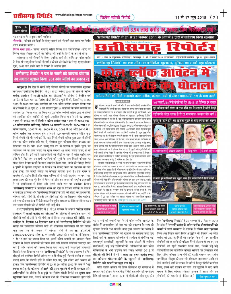‘छत्तीसगढ़ रिपोर्टर’ ने ‘कोल ब्लॉक आवंटन में लाखों करोड़ का घोटाला’ के शीर्षक से 21 नवंबर 2011 के अंक में 9 पृष्ठों में किया था पहला बड़ा खुलासा