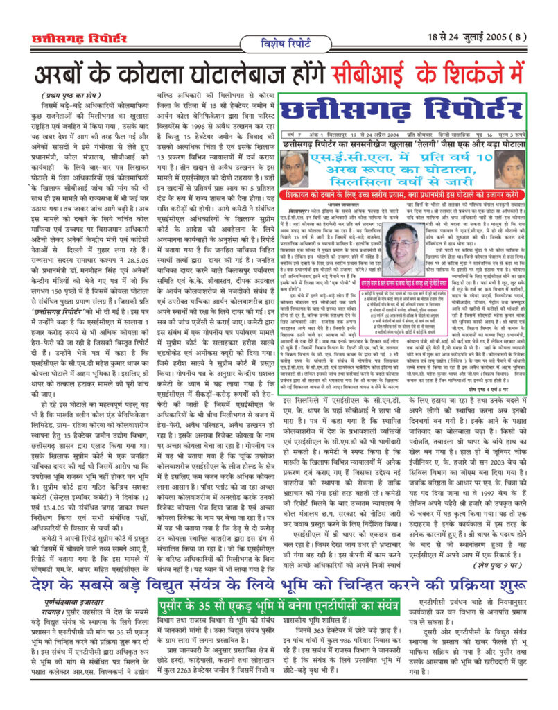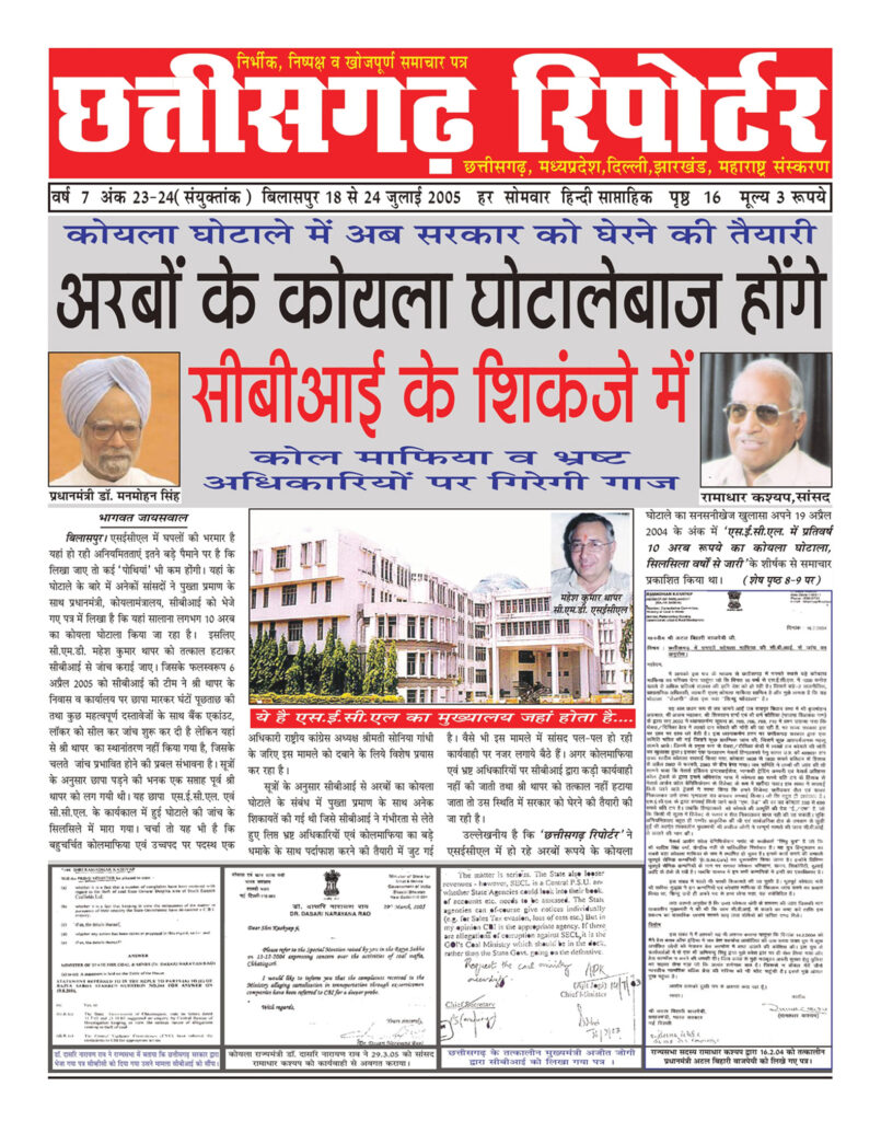 ‘छत्तीसगढ़ रिपोर्टर’ ने 18 जुलाई से 24 जुलाई 2005 के अंक में ‘अरबों के कोयला घोटालेबाज होंगे सीबीआई के शिकंजे में’ कोयला घाेटाले में अब सरकार को घेरने की तैयारी के शीर्षक से पांचवां बड़ा खुलासा किया था। जिसमें एसईसीएल में हो रही घोटाले के बारे में विभिन्न पार्टियों के सांसदों ने पुख्ता प्रमाण के साथ प्रधानमंत्री, कोयला मंत्रालय, सीबीआई को भेजे गए पत्र में लिखा है कि यहां सालाना लगभग 10 अरब का कोयला घोटाला किया जा रहा है। इसलिए सी.एम.डी. को तत्काल हटाकर सीबीआई से जांच कराई जाए। मालूम हो कि ‘छत्तीसगढ़ रिपोर्टर’ ने 11 से 17 अप्रैल 2005 के अंक में ‘सीएमडी पर सीबीआई का शिकंजा’, कोल माफिया व अधिकारियों में मचा हड़कंप के शीर्षक से चौथा खुलासा किया था जिसमें 6 अप्रैल 2005 को सीबीआई की टीम ने सी.एम.डी. के निवास व कार्यालय पर छापा मारकर घंटों पूछताछ की जिसमें कुछ महत्वपूर्ण दस्तावेज हाथ लगे और साथ ही बैंक एकांउट, लॉकर को सील कर जांच शुरू कर दी, लेकिन यहां से सी.एम.डी. का स्थानांतरण नहीं किया गया है, जिसके चलते जांच प्रभावित होने की प्रबल संभावना है। छापा पड़ने की भनक एक सप्ताह पूर्व सी.एम.डी. एवं कोलमाफिया को लग गयी थी। यह छापा एस.ई.सी.एल. एवं सी.सी.एल. के कार्यकाल में हुई घोटाले की जांच के सिलसिले में मारा गया उसे भी दबाने में लग गए। फिर ‘छत्तीसगढ़ रिपोर्टर’ ने 18 जुलाई से 24 जुलाई 2005 के अंक में ‘अरबों के कोयला घोटालेबाज होंगे सीबीआई के शिकंजे में’ कोयला घाेटाले में अब सरकार को घेरने की तैयारी के शीर्षक से पांचवां बड़ा खुलासा किया जिसमें विभिन्न पार्टियों के सांसदों द्वारा एसईसीएल में सालाना 10 अरब रुपए का कोयला घोटाले के संबंध में प्रधानमंत्री, कोयला मंत्रालय, सीबीआई को पुख्ता प्रमाण के साथ कार्यवाही के लिए लिख्रे गए पत्रों को ‘छत्तीसगढ़ रिपोर्टर’ ने प्रकाशित किया। इसके बाद कोयला मंत्रालय एवं कोल माफियाओं में भारी हड़कंप मच गया। फिर ‘छत्तीसगढ़ रिपोर्टर’ ने 1 से 7 अगस्त 2005 के अंक में ‘‘देश के सबसे बड़े कोयला घोटाले में शामिल कोल माफियाओं एवं अधिकारियों पर क्यों नहीं हो रही कार्रवाई ’’ सीएमडी के बचाव में जोगी ने सोनिया को लिखा पत्र के शीर्षक से छठवां बड़ा खुलासा किया। उसके बाद कोयला मंत्रालय अपनी साख बचाने के लिए बड़ी कार्रवाई करने में लग गया। इधर ‘छत्तीसगढ़ रिपोर्टर’ परत-दर-परत इस घोटालों से पर्दा उठाते जा रहा था औरइस खुलासों को आमजनों तक पहुंचाने के लिए राष्ट्रीय न्यूज चैनल जी न्यूज, आज तक, एनडीटीवी, स्टार न्यूज, सहारा समय और ई टीवी में ‘छत्तीसगढ़ रिपोर्टर’ के इन बड़े-बड़े खुलासों को हर सप्ताह विज्ञापन के रूप में दिखाया जाता था । कुछ न्यूज चैनलों में दिखाए जा रहे उस विज्ञापनों को घोटालेबाजों द्वारा रो