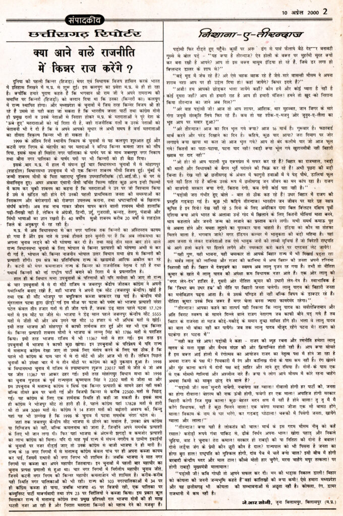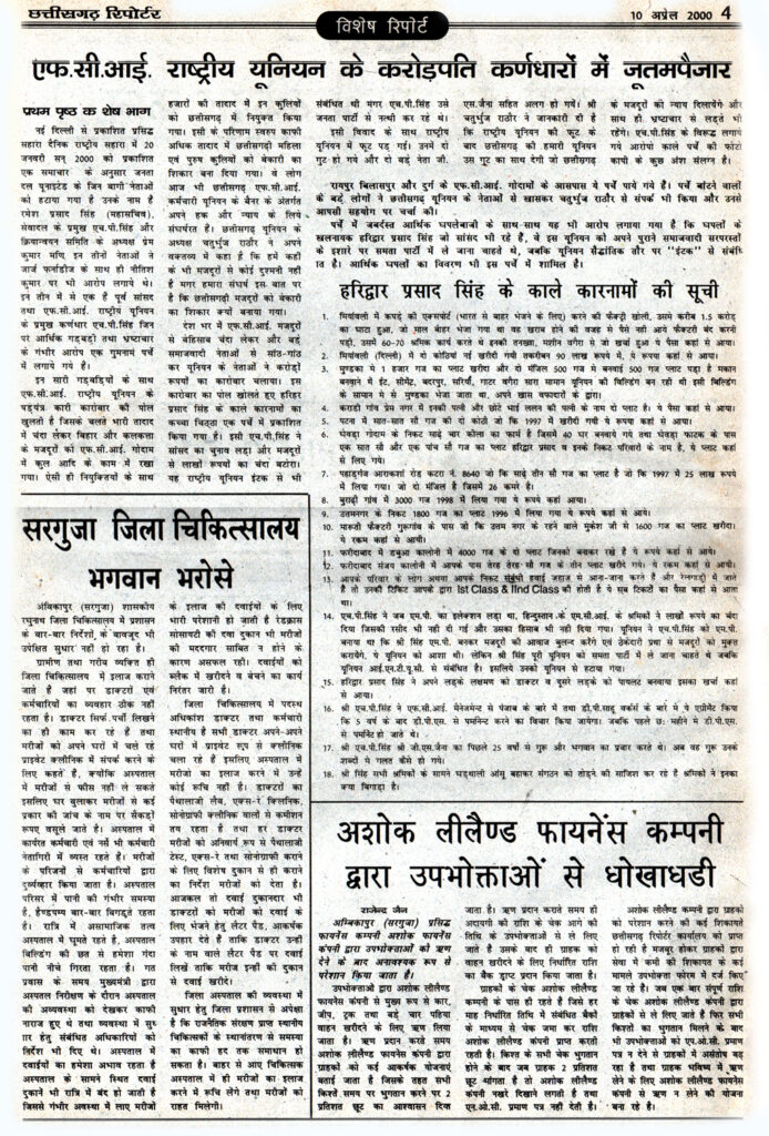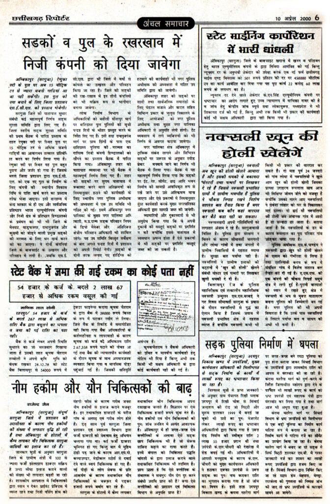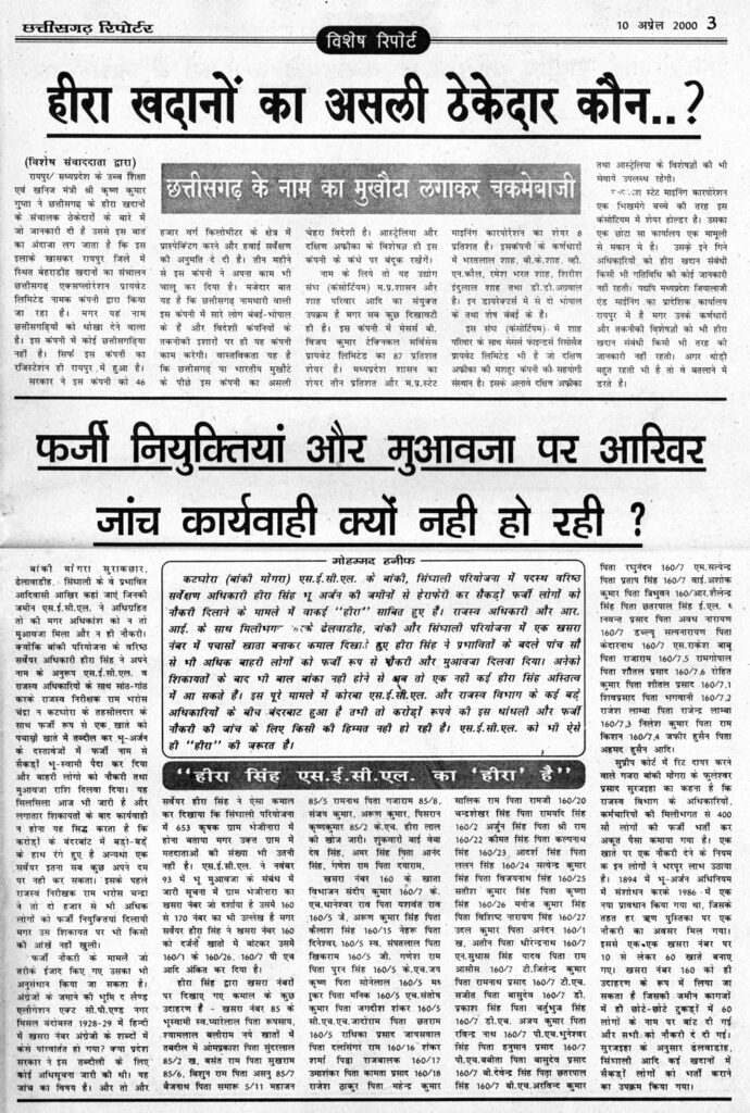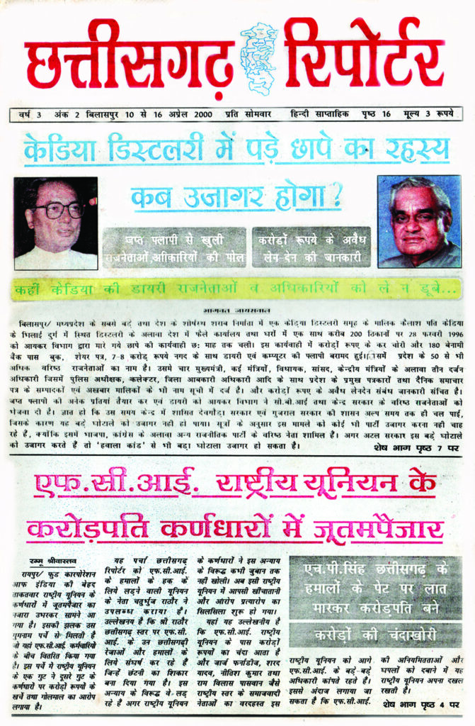 ‘छत्तीसगढ़ रिपोर्टर’ ने 10 से 16 अप्रैल 2000 के अंक में ‘केडिया डिस्टलरी में पड़े छापे का रहस्य कब उजागर होगा?’ जब्त फ्लापी से खुली राजनेताओं, अधिकारियों की पोल के शीर्षक से समाचार प्रकाशित किया था । जिसमें मध्यप्रदेश के सबसे बड़े तथा देश के शीर्षस्थ शराब निर्माता में एक केडिया डिस्टलरी समूह के मालिक कैलाश पति केडिया के भिलाई दुर्ग में स्थित डिस्टलरी के अलावा देश में फैले कार्यालय तथा घरों में एक साथ करीब 200 ठिकानों पर 28 फरवरी 1996 को आयकर विभाग द्वारा मारे गये छापे की कार्यवाही छ: माह तक चली थी। इस कार्यवाही में करोड़ों रुपए के कर चोरी और 180 बेनामी बैंक पास बुक, शेयर पत्र, 7-8 करोड़ रुपये नगद के साथ डायरी एवं कम्प्यूटर की फ्लापी बरामद हुई थी। जिसमें प्रदेश के 50 से भी अधिक वरिष्ठ राजनेताओं के नाम थे। उसमे चार मुख्यमंत्री, कई मंत्रियों, विधायक, सांसद, केन्द्रीय मंत्रियों के अलावा तीन दर्जन अधिकारी जिसमें पुलिस अधीक्षक, कलेक्टर, जिला आबकारी अधिकारी आदि के साथ प्रदेश के प्रमुख पत्रकारों तथा दैनिक समाचार पत्र के सम्पादकों एवं अखबार मालिकों के भी नाम सूची में दर्ज थे। इसके साथ ही करोड़ों रुपए के अवैध लेनदेन संबंधित जानकारी संचित है। जब्त फ्लापी की अनेक प्रतियां तैयार कर एवं डायरी को आयकर विभाग ने सी.बी.आई तथा केन्द्र सरकार के वरिष्ठ राजनेताओं को भेजवा दी थी। ज्ञात हो कि उस समय केन्द्र में शासित देवगौड़ा सरकार एवं गुजराल सरकार की शासन अल्प समय तक ही चल पाई थी, जिसके कारण यह बड़ा घोटाला उजागर नही हो पाया। सूत्रों के अनुसार इस मामले को कोई भी पार्टी उजागर करना नही चाहती थी, क्योंकि इसमें भाजपा, कांग्रेस के अलावा अन्य राजनीतिक पार्टियों के वरिष्ठ नेता शामिल थे। अगर अटल सरकार इस बड़े घोटाले को उजागर करता तो ‘हवाला कांड’ से भी बड़ा घोटाला उजागर हो सकता था। छत्तीसगढ़ रिपोर्टर के इस खुलासे केे बाद अधिकारियों एवं राजनेताओं में भारी तहलका मच गया और इस मामले को दबाने में लग गए। क्योंकि चार मुख्यमंत्री, कई मंत्रियों, विधायक, सांसद, केन्द्रीय मंत्रियों के अलावा तीन दर्जन अधिकारी जिसमें पुलिस अधीक्षक, कलेक्टर, जिला आबकारी अधिकारी आदि के साथ प्रदेश के प्रमुख पत्रकारों तथा दैनिक समाचार पत्र के सम्पादकों एवं अखबार मालिकों के भी नाम सूची में दर्ज था।