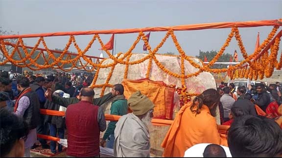 अयोध्या 02 फरवरी 2023। नेपाल के प्रसिद्ध धार्मिक स्थल जनकपुर से अयोध्या लाई गई देवसिला का पूजन हुआ। नेपाल के पूर्व उप प्रधानमंत्री जानकी मंदिर के महंत ने पूजन किया। वैदिक रीति रिवाज से पूजन के बाद शालिग्राम शिला श्रीराम जन्मभूमि तीर्थ क्षेत्र ट्रस्ट को सौंपी गई। इससे पहले, नेपाल के जनकपुर से चलकर शालिग्राम शिला बुधवार की देर रात रामनगरी पहुंची। भगवान विष्णु का स्वरूप मानी जाने वाली इस शिला का रामनगरी में भव्य अभिनंदन किया गया। हाईवे से जैसे ही देर रात शालिग्राम यात्रा ने प्रवेश किया तो जय श्री राम के नारे गूंजने लगे। लोगों ने पुष्प वर्षा की तो जमकर आतिशबाजी भी हुई। अयोध्या पहुंचने पर शालिग्राम शिला पर श्री राम जन्मभूमि तीर्थ क्षेत्र ट्रस्ट के महासचिव चंपत राय, ट्रस्टी डॉक्टर अनिल मिश्र, निवर्तमान महापौर ऋषिकेश उपाध्याय सहित अन्य भाजपा नेताओं ने पुष्प वर्षा कर स्वागत किया।
