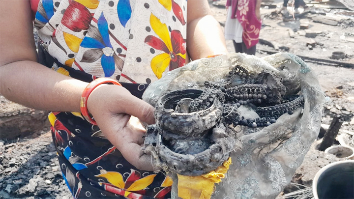 देर रात 3.30 बजे के करीब बेटी ने फोन करके बताया कि मम्मी बड़ी आग लगी है। जल्दी आ जाओ। मौके पर आकर देखा तो पूरी बस्ती में आग लगी थी। मेरे घर का पूरा सामान जल गया था। आग लगने के बाद यहां करीब 4 सिलेंडर फटे। जिससे बस्ती के पूरे घर जल गए। गहने जल गए हैं। सोना और पैसा का पता नहीं चल रहा है।