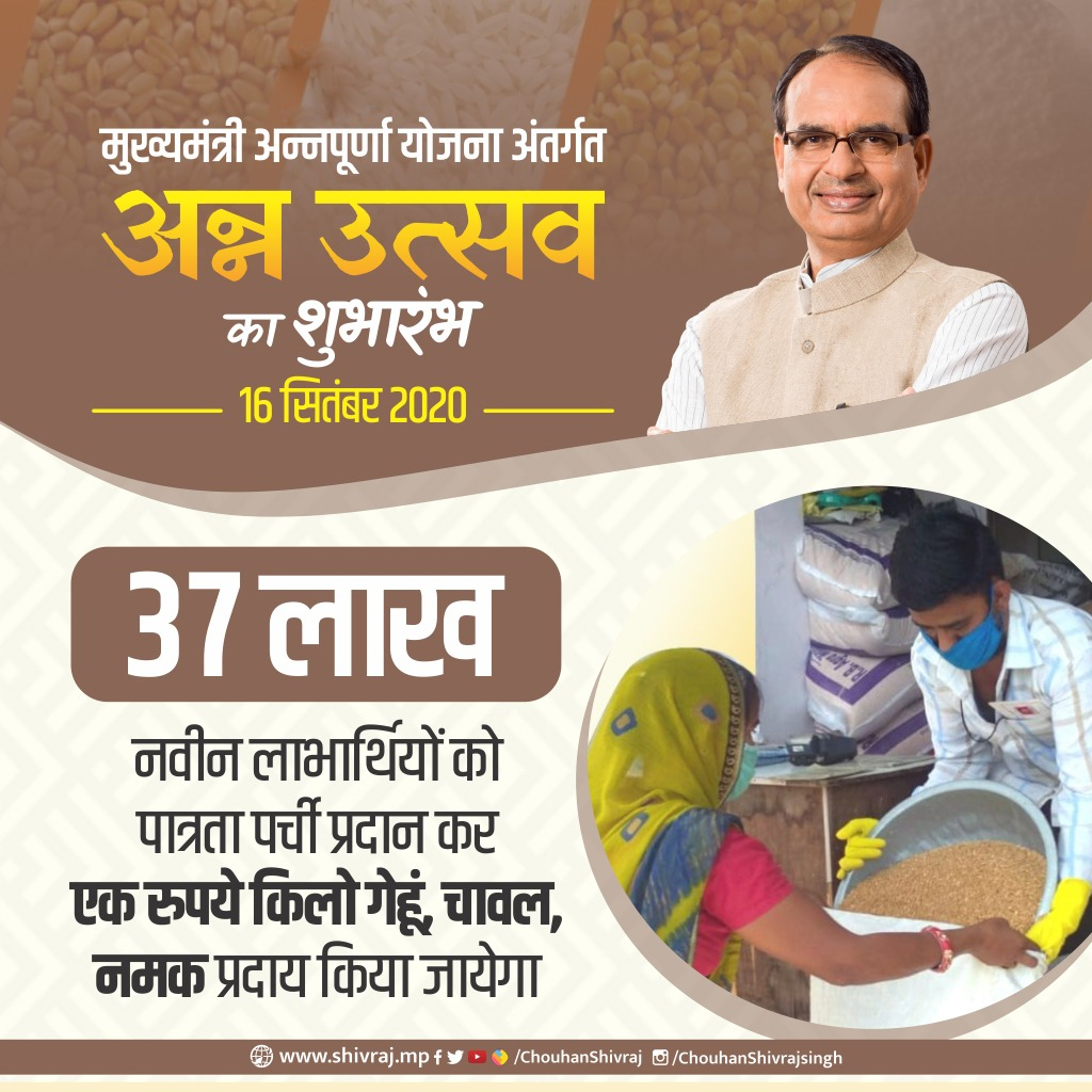भोपाल 16 सितम्बर 2020। मुख्यमंत्री शिवराज सिंह चौहान आज मध्य प्रदेश के 36 लाख 86 हजार 856 गरीबों को राष्ट्रीय खाद्य सुरक्षा अधिनियम के तहत पात्रता पर्ची जारी करेंगे। समन्वय भवन में दोपहर बाद होने वाले कार्यक्रम में सीएम चौहान इन गरीब परिवारों को पात्रता पर्ची देने के साथ अन्न उत्सव का शुभारंभ भी करेंगे।