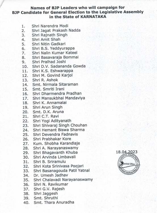 बेंगलुरु 19 अप्रैल 2023। कर्नाटक विधानसभा चुनाव के लिए सभी पार्टियां चुनावी अभियान में डटी हुई हैं। इसी बीच, बीजेपी ने अपने स्टार प्रचारकों की लिस्ट जारी कर दी है। प्रधानमंत्री नरेंद्र मोदी, केंद्रीय गृह मंत्री अमित शाह, भाजपा अध्यक्ष जेपी नड्डा, रक्षा मंत्री राजनाथ सिंह समेत 40 बड़े नेताओं के नाम शामिल हैं। स्टार प्रचारकों की लिस्ट जारी होने के साथ ही बीजेपी के तमाम बड़े नेता रैलियां कर और कार्यकर्ता लोगों के बीच जाकर भाजपा के पक्ष में वोट मांगेंगे।
