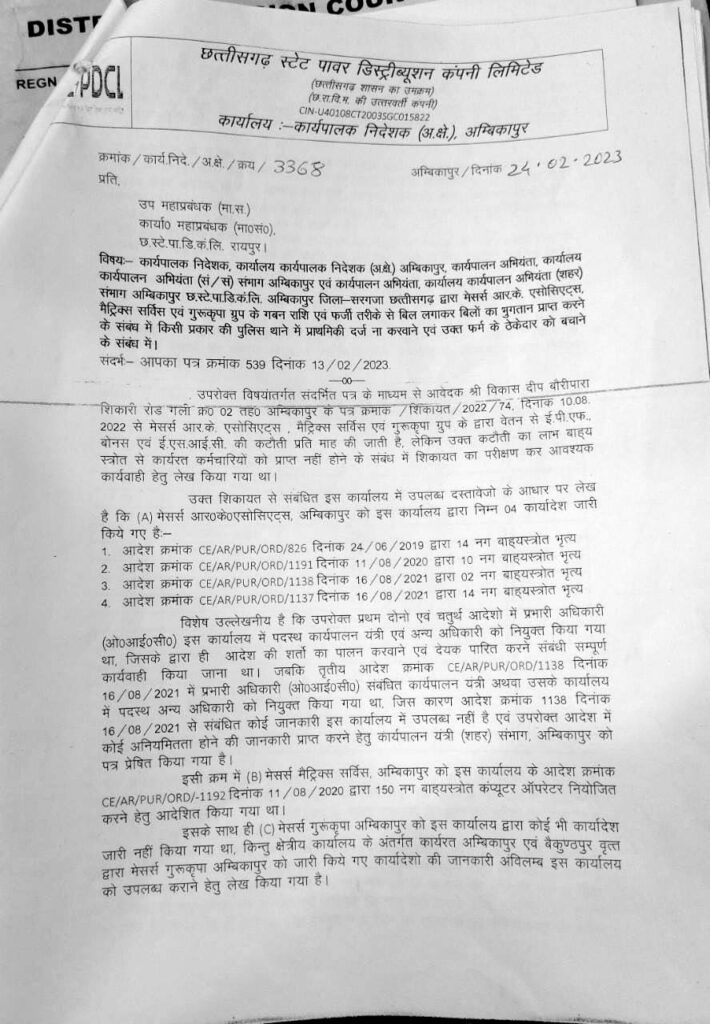 मेसर्स आर.के. एसोसिएट्स, मैट्रिक्स सर्विस एवं गुरुकृपा ग्रुप के द्वारा वेतन से ई.पी.एफ. बोनस एवं ई.एस.आई.सी. की कटौती प्रति माह की जाती है लेकिन उक्त कटौती का लाभ बाह्य स्रोत से कार्यरत कर्मचारियों को प्राप्त नहीं होने के संबंध में शिकायत का परीक्षण कर आवश्यक कार्यवाही हेतु लिखा गया था उक्त शिकायत के संबंध में कार्यपालन निदेशक(अ.क्षे.) छ.स्टे.पा.डि.कं.लि. अंबिकापुर में उपलब्ध दस्तावेजों के आधार पर मेसर्स आर.के. एसोसिएट्स अंबिकापुर को चार कार्यादेश जारी किए गए। प्रथम दोनों एवं चतुर्थ आवेदन आदेशों में प्रभारी अधिकारी (ओआईसी)कार्यपालन निदेशक के कार्यालय में पदस्थ कार्यपालन यंत्री एवं अन्य अधिकारी को नियुक्त किया गया था जिसके द्वारा ही आदेश की शर्तों का पालन करवाने एवं देयक पारित करने संबंधित संपूर्ण कार्यवाही किया जाना था जबकि तृतीय आदेश क्रमांक CE/AR/PUR/ORD/1138 दिनांक 16/1/2021 प्रभारी अधिकारी (ओआईसी) संबंधित कार्यपालन यंत्री अथवा उसके कार्यालय में पदस्थ अन्य अधिकारी को नियुक्त किया गया था। इसी क्रम मेसर्स मेट्रिक सर्विस अंबिकापुर को कार्यपालन निदेशक के कार्यालय के आदेश क्रमांक CE/AR/PUR/ORD/1192 दिनांक 11/8/2020 द्वारा 150 नग बाह्य स्रोत कंप्यूटर ऑपरेटर नियोजित करने हेतु आदेशित किया गया था इसके साथ ही मेसर्स गुरुकृपा अंबिकापुर को कोई भी कार्यादेश जारी नहीं किया गया था।