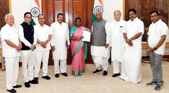 मणिपुर की स्थिति को लेकर मंगलवार दोपहर कांग्रेस अध्यक्ष मल्लिकार्जुन खरगे ने पार्टी नेताओं के एक प्रतिनिधिमंडल के साथ नई दिल्ली स्थित राष्ट्रपति भवन पहुंचे। यहां उन्होंने राष्ट्रपति द्रौपदी मुर्मू से मुलाकात की। वहीं, कांग्रेस नेता ने बताया कि मणिपुर के बिगड़ते हालात को काबू लाने के लिए उन्होंने मुलाकात के दौरान राष्ट्रपति को एक ज्ञापन सौंपा। नेता ने कहा कि हमने सुप्रीम कोर्ट के एक सेवारत या सेवानिवृत्त न्यायाधीश की अध्यक्षता में एक उच्चस्तरीय जांच आयोग के गठन सहित 12 मांगें रखी हैं।