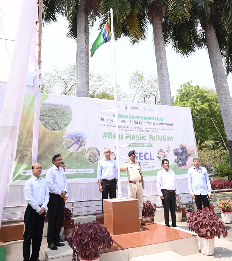 बिलासपुर 05 जून 2023। एसईसीएल मुख्यालय प्रशासनिक भवन प्रांगण में विश्व पर्यावरण दिवस सोल्लासपूर्ण मनाया गया । इस अवसर पर प्रारंभ में मुख्य अतिथि अध्यक्ष सह प्रबंध निदेशक डॉ. प्रेम सागर मिश्रा ने निदेशक तकनीकी (संचालन) एस.के. पाल, निदेशक (वित्त) जी. श्रीनिवासन, निदेशक (कार्मिक) देबाशीष आचार्या, मुख्य सतर्कता अधिकारी जयंत कुमार खमारी, महाप्रबंधक (पर्यावरण) बी.के. जेना, विभिन्न विभागाध्यक्षों, अधिकारियों-कर्मचारियों की उपस्थिति में पर्यावरण ध्वज फहराया उपरांत कोलइण्डिया कॉरपोरेट गीत बजाया गया । इस अवसर पर पर्यावरण विषयक पोस्टर का विमोचन मंचस्थ अतिथियों द्वारा किया गया। इस अवसर पर प्रतिज्ञा का पठन अध्यक्ष सह प्रबंध निदेशक ने किया जिसे समस्त उपस्थितों ने दोहराया। अपने सम्बोधन में मुख्य अतिथि अध्यक्ष सह प्रबंध निदेशक डॉ. प्रेम सागर मिश्रा ने कहा सतत धारणीय रूप से कोयले का खनन हमारे संचालन का अभिन्न अंग है। वसुन्धरा को एक बेहतर कल के लिए संवरित करने हेतु हम प्रतिबद्ध हैं। हमारा प्रत्येक खनिक दृढ़ मनोबल लेकर प्रकृति को संरक्षित एवं सवंर्धित करने के लिए कृत संकल्पित हैं। यह हमारे उन जीवन मूल्यों के अनुसार ही है जैसा हमारे वेद शास्त्रों में उल्लेखित है – रक्षये प्रकृति पांतुलोकाः – हे धरा के वासियों! प्रकृति की रक्षा करो।