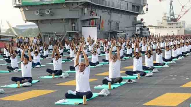 नई दिल्ली 21 जून 2023। आज योग दिवस पर पूरी दुनिया के लोग योग कर स्वास्थ्य को बेहतर रखने का संदेश दे रहे हैं। इस अवसर पर देश के रक्षा मंत्री राजनाथ सिंह ने कोची में आईएनएस विक्रांत पर देश के सैनिकों के साथ योग किया। उन्होंने कहा कि पीएम नरेंद्र मोदी के प्रयास से योग को अंतरराष्ट्रीय स्तर पर विशेष लोकप्रियता मिली। अब पूरी दुनिया में योग का विकास हो रहा है। उन्होंने कहा कि योग के द्वारा बिना एक पैसा खर्च किए लोग अपने शरीर और मन को स्वस्थ रख सकते हैं। कोरोना महामारी के दौरान भी योग का महत्त्व दुनिया के सामने आया था, जब लोगों ने योग के जरिए स्वयं को स्वस्थ रखने में सफलता पाई थी। उन्होंने कहा कि योग युगों-युगों से भारत की पहचान रहा है।