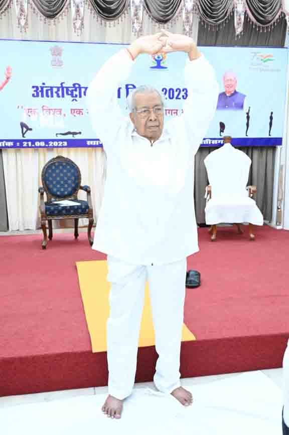 रायपुर 21 जून 2023। राज्यपाल विश्वभूषण हरिचंदन आज राजभवन में अंतर्राष्ट्रीय योग दिवस के अवसर पर आयोजित योग शिविर मेें शामिल हुए। उन्होंने राजभवन के अधिकारियों, कर्मचारियों के साथ मिलकर योगासन और प्राणायाम भी किया। इस अवसर पर छत्तीसगढ़ योग आयोग के अध्यक्ष ज्ञानेश शर्मा, राज्यपाल के सचिव अमृत खलखो भी उपस्थित थे।