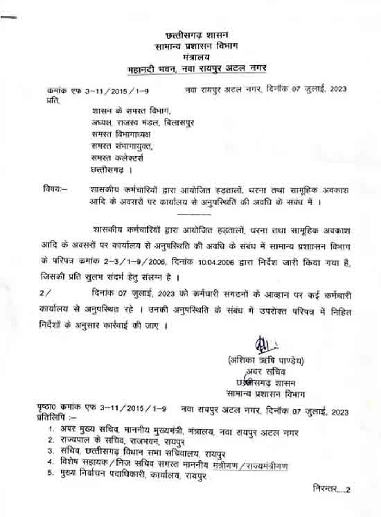 रायपुर 08 जुलाई 2023। छत्तीसगढ़ में कर्मचारियों के सामूहिक अवकाश लेकर हड़ताल करने पर राज्य सरकार ने सख्ती दिखाई है। इस तरह से हड़ताल करना कर्मचारियों को भरी पड़ सकता है। इससे दफ्तरों में सन्नाटा फैल जाता है। कई काम ठप पड़ जाते हैं। इसे देखते हुए सामान्य प्रशासन विभाग की अपर सचिव अंशिका ऋषि पाण्डेय ने सभी विभागाध्यक्षों, संभाग आयुक्तों, कलेक्टर्स को पत्र लिखकर कार्रवाई करने की निर्देश जारी किया है। इतना ही नहीं सैलरी से कटौती करने का भी आदेश जारी किया है।