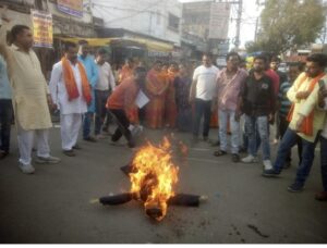 गुरूवार को मनेन्द्रगढ़ शहर के गांधी चौक में कर्नाटक राज्य में हुए जैन मुनि आचार्य काम कुमार नदी सागर महाराज का अपहरण कर निर्मम हत्या कर दी गई । जिसके विरोध में हत्यारों कों आतंक पर्याय बताकर उनका पुतला दहन किया गया। इस अवसर पर पुलिस विभाग बड़ी संख्या में मौजूद थे।