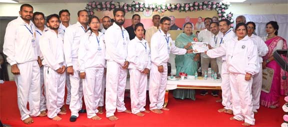 रायपुर 31 जुलाई 2023। समाज कल्याण मंत्री श्रीमती अनिला भेंड़िया के मुख्य आतिथ्य में फंुडहर स्थित योग भवन रायपुर में सात दिवसीय संभागीय निःशुल्क योग शिविर का समापन हुआ। कार्यक्रम की अध्यक्षता छत्तीसगढ़ योग आयोग के अध्यक्ष ज्ञानेश शर्मा ने की। विशेष अतिथि के रूप में योग आयोग के सदस्य रविंद्र सिंह ठाकुर एवं राजेश नारा उपस्थित थे। श्रीमती भेंड़िया ने सभी प्रशिक्षणार्थियों को प्रमाण पत्र वितरित किया गया। शिविर में दुर्ग जिले के 240 प्रशिक्षणार्थियों ने भाग लिया। छत्तीसगढ़ में 700 मास्टर ट्रेनर्स तैयार किए जा चुके हैं।