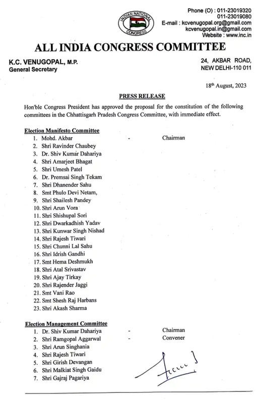 रायपुर 18 अगस्त 2023। छत्तीसगढ़ कांग्रेस ने अपनी चुनावी समितियों की तीन सूची एक साथ जारी कर दी है। कांग्रेस के जनरल सेक्रेटरी केसी वेणुगोपाल ने लिस्ट जारी की है। जिसमें घोषणा पत्र समिति की जिम्मेदारी मंत्री मोहम्मद अकबर को दी गई है, इस लिस्ट में 23 लोगों को शामिल किया गया है। इलेक्शन मैनेजमेंट कमेटी में शिव डहरिया को अध्यक्ष बनाया गया है। रामगोपाल अग्रवाल कन्वेयर की भूमिका में रहेंगे। इसमें 7 सदस्य शामिल है। डिसिप्लिनरी एक्शन कमेटी में धनेन्द्र साहू को अध्यक्ष बनाया गया है। 9 सदस्यों को इस लिस्ट में जगह दी गई है। वहीं प्लानिंग एंड स्ट्रैटेजी कमेटी के लिए ताम्रध्वज साहू को अध्यक्ष की जिम्मेदारी दी गई है। 18 कांग्रेस नेताओं के नाम लिस्ट में शामिल हैं। इसके अलावा 11 जिलों के जिला अध्यक्षों की सूची भी जारी की गई है।