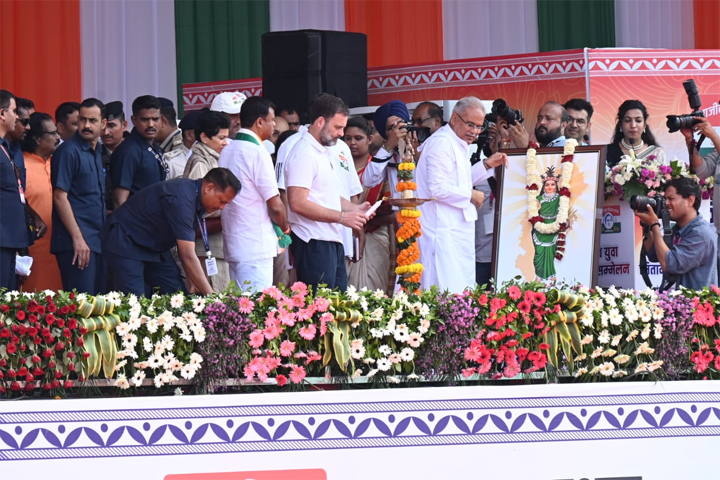 राजीव युवा मितान सम्मेलन : छत्तीसगढ़ महतारी के छायाचित्र में माल्यार्पण तथा राजगीत अरपा पैरी की धार के साथ कार्यक्रम की शुरूआत