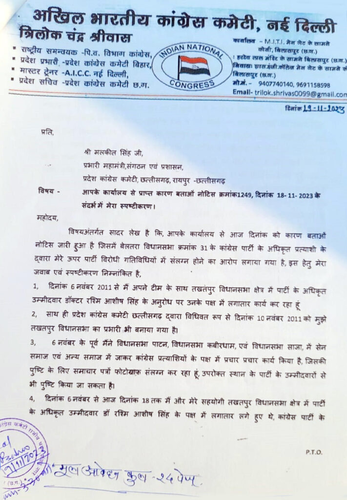 बिलासपुर 20 नवंबर 2023। जिले एवं प्रदेश के कांग्रेस नेता त्रिलोक चंद्र श्रीवास, सचिव -प्रदेश कांग्रेस कमेटी छत्तीसगढ़ ,को बेलतरा विधानसभा क्षेत्र के अधिकृत प्रत्याशी के शिकायत के आधार पर प्रदेश कांग्रेस कमेटी छत्तीसगढ़ द्वारा कारण बताओं नोटिस जारी किया गया था, जिसके तारतमय में त्रिलोक चंद्र श्रीवास ने आज प्रदेश कांग्रेस कमेटी में अपने सहयोगियों सहित उपस्थित होकर कारण बताओं नोटिस का सप्रमाण जवाब प्रस्तुत किया है, त्रिलोकचंद श्रीवास ने कहा कि वह कांग्रेस के निष्ठावान सिपाही हैं ,बेलतरा विधानसभा क्षेत्र के स्वाभाविक दावेदार होने के पश्चात भी उन्हें टिकट नहीं मिला, उसके पश्चात वह कांग्रेस के पक्ष में कार्य किया और प्रदेश में पाटन विधानसभा, साजा विधानसभा, कवर्धा विधानसभा एवं जहां-जहां प्रत्याशियों ने उन्हें आमंत्रित किया वह वहां जाकर कांग्रेस पार्टी के पक्ष में कार्य किए हैं, प्रदेश कांग्रेस कमेटी ने उन्हें तखतपुर विधानसभा का प्रभारी बनाया, वहां वह पूरे 12 दिन से ज्यादा समय तक अपने सहयोगियों सहित तखतपुर विधानसभा क्षेत्र के कांग्रेस उम्मीदवार वर्तमान में संसदीय सचिव डॉक्टर रश्मि आशीष सिंह के पक्ष में कार्य किया, 50 सभाएं ली है, उन्होंने अपने जवाब में कहा कि विजय केसरवानी पिछले 5 वर्षों से ज्यादा समय से उन्हें मानसिक रूप से प्रताड़ित कर रहे हैं, वह कांग्रेस के प्रदेश और राष्ट्रीय पदाधिकारी रहे हैं उनकी पत्नी बेलतरा से जिला पंचायत सदस्य है ,भाई बहु नगर निगम की पार्षद है , उसके पश्चात भी उन्हें या उनके पारिवारिक जनों को कभी भी बेलतरा-विधानसभा क्षेत्र में होने वाले मीटिंग, सभा सम्मेलनों की सूचना नहीं दिया गया, लगातार उनसे अपमानजनक व्यवहार एवं उपेक्षित व्यवहार किया गया है।
