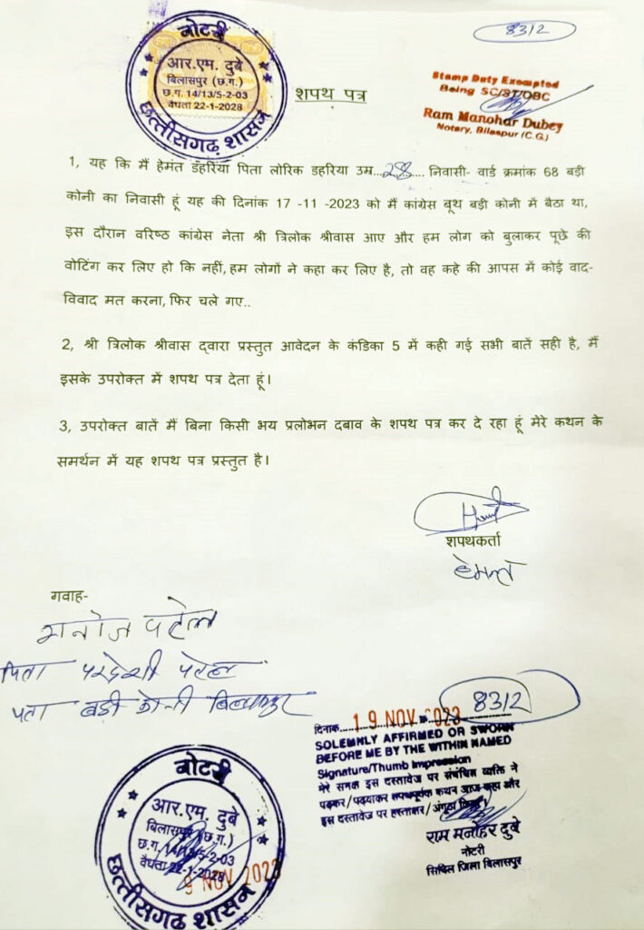 उन्होंने यह भी कहा कि भविष्य में त्रिलोक को पार्टी में कोई बड़ा पद ना मिले, इसलिए अपने नाकामी का ठीकरा त्रिलोक के ऊपर फोड़ने की तैयारी के लिए या मनगढ़ंत और झूठा आरोप लगाया गया है ,साथ ही साथ तथा कथित रूप से कोनी के मतदान केंद्र में कांग्रेस कार्यकर्ताओं को बरगलाने का जो आरोप लगा है, उस पर जिन कार्यकर्ताओं के हवाले से यह आरोप लगाया गया था, उन् कार्यकर्ताओं ने शपथ पत्र देकर कहा कि मतदान समाप्ति के पूर्व वरिष्ठ कांग्रेस नेता त्रिलोक चंद्र श्रीवास वहां पहुंचे और उन्हें बुलाकर यह कहा कि मतदान के लिए कुछ समय बचा हैं ,मतदान के बाद आपस में वाद विवाद नहीं करना, और वोटिंग किए हो कि नहीं ,यह पूछ कर चले गए, यह मतदान के दिन समय लगभग 4:30 का था और मतदान समाप्त होने में मात्र आधे घंटे थे, यदि उन्हें विरोध करना होता तो वह पहले से ही कोनी क्षेत्र या बेलतरा-क्षेत्र के लोगों को मना करते ,आधा घंटा पहले कैसे किसी व्यक्ति को मना करेंगे, और वह स्वयं इतने वरिष्ठ हैं कि कभी पार्टी के विरुद्ध नहीं जा सकते, त्रिलोक श्रीवास की छवि धूमिल करने के लिए यह झूठl और निराधार आरोप लगाया गया है, त्रिलोक श्रीवास ने बताया कि कोनी निवासी कालू सोनी, मदन पांडे और नीलम खंiडे पूर्व में उनके विरुद्ध दर्जनों झूठi शिकायत आवेदन लगा चुके हैं, यह वही लोग हैं जो भाजपा शासन काल में भारतीय जनता पार्टी कार्यकर्ता थे, और उनके ऊपर और उनके परिजनों सहयोगियों के ऊपर झूठi अपहरण कैस लगाए थे ,जो बाद में पुनर जांच में झूठा साबित होकर खत्मi खारिज हुआ है, तखतपुर विधानसभा क्षेत्र के कांग्रेस के उम्मीदवार संसदीय सचिव डॉक्टर रश्मि आशीष सिंह ने प्रदेश प्रभारी कुमारी शैलजा, मुख्यमंत्री भूपेश बघेल एवं प्रदेश अध्यक्ष श्री दीपक बैज को लिखे अपने लेटर में कहा है कि त्रिलोक चंद्र श्रीवास ने उनके साथ रहकर कांग्रेस पार्टी के पक्ष में कार्य किया है, जिससे उन्हें एवं पार्टी को लाभ होगा, इससे स्पष्ट है कि त्रिलोक श्रीवास ने कहीं भी पार्टी लाइन से बाहर जाकर खुलाघात या भीतरघात नहीं किया है, क्योंकि बेलतरा-से कांग्रेस के वर्तमान उम्मीदवार बाहरी है, और स्थानीय मजबूत जनआधार वाले नेताओं को किनारा करना चाहते हैं, इसलिए झूठi अनर्गल आरोप लगा रहे हैं, त्रिलोक चंद्र श्रीवास ने कहा कि पूरे विधानसभा क्षेत्र के हजारों कार्यकर्ताओं एवं आम जनता का उन पर निर्दलीय विधानसभा चुनाव लड़ने का भारी दबाव था, जिसे उन्होंने पार्टी आला कमान के नेताओं के समझाइस पर उनके सम्मान में चुनाव नहीं लड़ा, एवं पार्टी के पक्ष में कार्य करने का निर्णय लिया है, इस अवसर पर त्रिलोक चंद्र श्रीवास ने अपने आवेदन के साथ 24 पेज का प्रदेश के विभिन्न हिस्सों में किए कार्यों के वीडियो, सीडी फोटोग्राफ संलग्न किए हैं, त्