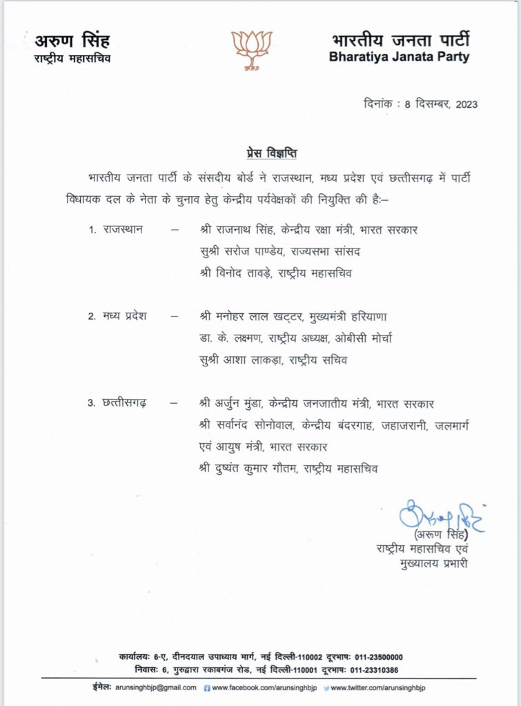 इसी तरह मध्यप्रदेश के लिए के मनोहल लाल, के लक्ष्मण ,आशा लकड़ा जबकि राजस्थान में किये सरोज पांडेय, राजनाथ और विनोद तावड़े को जिम्मेदारी दी गई है। पर्यवेक्षक दोनों राज्यों का दौरा कर विजयी रहे भाजपा विधायकों से नए मुख्यमंत्रियों के नामों को लेकर राय मशविरा करेंगे। जिसके बाद नाम नेतृत्व को भेजे जायेंगे।