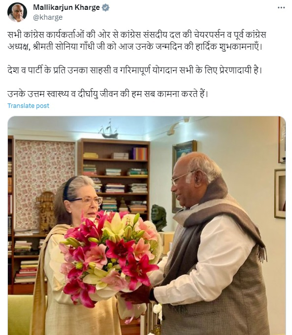 नई दिल्ली 09 दिसंबर 2023। कांग्रेस अध्यक्ष मल्लिकार्जुन खरगे और पार्टी के कई वरिष्ठ नेताओं ने शनिवार को पार्टी संसदीय दल की प्रमुख सोनिया गांधी को जन्मदिन पर बधाई दी और उनके स्वस्थ जीवन एवं दीर्घायु होने की कामना की। खरगे ने ‘एक्स’ पर पोस्ट किया, ‘‘सभी कांग्रेस कार्यकर्ताओं की ओर से कांग्रेस संसदीय दल की प्रमुख व पूर्व कांग्रेस अध्यक्ष सोनिया गांधी जी को आज उनके जन्मदिन की हार्दिक शुभकामनाएं। देश व पार्टी के प्रति उनका साहसी व गरिमापूर्ण योगदान सभी के लिए प्रेरणादायी है। उनके उत्तम स्वास्थ्य व दीर्घायु जीवन की हम सब कामना करते हैं।