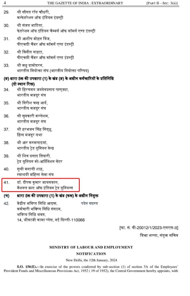 नई दिल्ली 15 जनवरी 2024। भारत सरकार के श्रम एवं रोजगार मंत्रालय ने एनएफआईटीयू के राष्ट्रीय अध्यक्ष डाॅ दीपक जायसवाल को कर्मचारी भविष्य निधि संगठन का सदस्य नियुक्त किया है जिसका भारत के आधिकारिक राजपत्र में प्रकाशित हुआ है जो दिनाँक 12-01-2024 से लागू किया गया है। अध्यक्ष डाॅ दीपक जायसवाल को उक्त कमेटी का सदस्य मनोनीत करने पर संगठन के समस्त पदाधिकारियों में हर्षोल्लास एवं खुशी का अनुभव कर रहे है तथा अध्यक्ष डाॅ दीपक जायसवाल को संगठन के समस्त पदाधिकारियों की तरफ से हार्दिक शुभकामनाएँ एवं बधाई प्रदान किये।