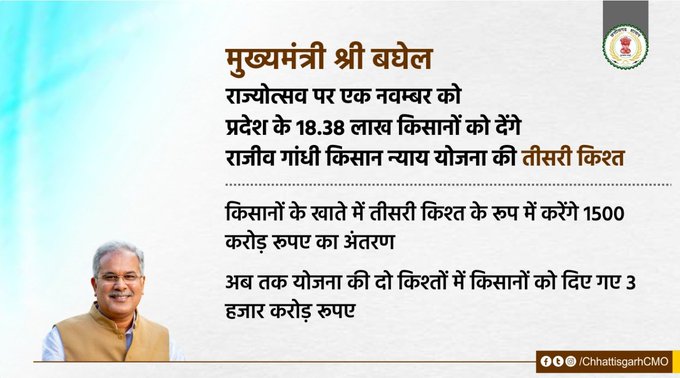 रायपुर 31 अक्टूबर 2020। मुख्यमंत्री भूपेश बघेल राज्य स्थापना दिवस के अवसर पर राज्योत्सव के कार्यक्रम में प्रदेश के 18 लाख 38 हजार 592 किसानों के खाते में राजीव गांधी किसान न्याय योजना की तीसरी किश्त के रूप में 1500 करोड़ रूपए की राशि का अंतरण करेंगे। कृषि क्षेत्र में पर्याप्त निवेश और काश्त लागत में राहत देने के लिए छत्तीसगढ़ सरकार द्वारा राजीव गांधी किसान न्याय योजना के तहत किसानों को आदान सहायता राशि प्रदान की जा रही है। इस योजना के तहत प्रथम और द्वितीय किश्त की राशि के रूप में 1500-1500 करोड़ रूपए, कुल 3 हजार करोड़ रूपए का भुगतान किसानों के बैंक खाते में प्रत्यक्ष लाभ हस्तांतरण (डी.बी.टी.) के माध्यम से किया जा चुका है। राजीव गांधी किसान न्याय योजना में चार किश्तों में किसानों को 5750 करोड़ रूपए का भुगतान किया जाएगा।