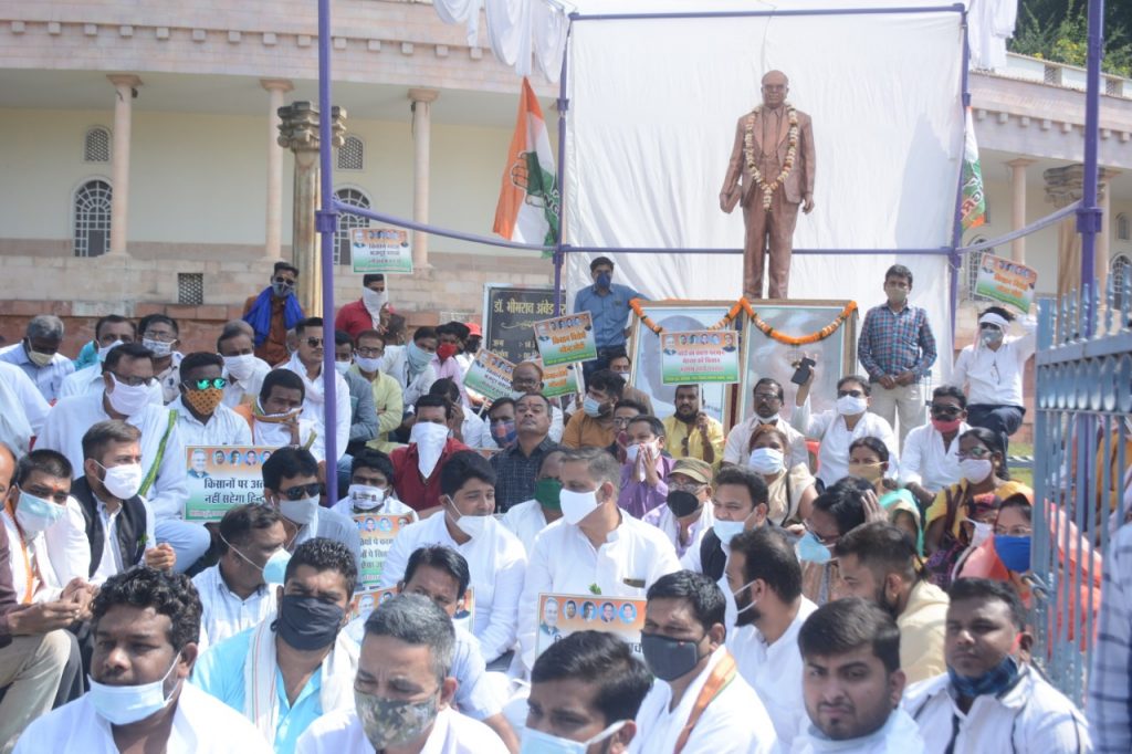 रायपुर 31 अक्टूबर 2020। लौह पुरूष सरदार वल्लभ भाई पटेल जी की जयंती एवं पूर्व प्रधानमंत्री प्रियदर्शनी इंदिरा गांधी जी के शहादत दिवस पर कांग्रेस ने पूरे राज्य में किसान अधिकार दिवस मनाया। प्रदेश के सभी जिला मुख्यालयों में आज मोदी सरकार के किसान-मजदूर विरोधी कानूनों के विरोध में किसान सत्याग्रह का आयोजन किया गया जिसमें बड़ी संख्या में किसानों, कांग्रेस के निर्वाचित जनप्रतिनिधियों, पार्टी मोर्चा संगठनों प्रकोष्ठों के पदाधिकारियों, कार्यकर्ताओं ने भाग लिया।