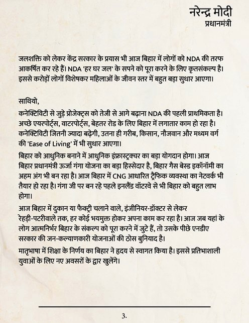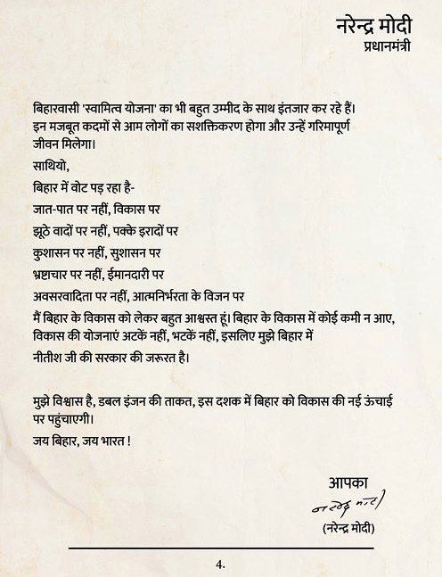 प्रधानमंत्री ने लिखा कि ‘मेरे प्रिय बिहार के भाइयो और बहनों, सादर प्रणाम। आज इस पत्र के माध्यम से आपसे बिहार के विकास, विकास के लिए एनडीए पर विश्वास और विश्वास बनाए रखने के लिए एनडीए के संकल्प के बारे में बात करना चाहता हूं। पीएम मोदी ने बिहार की जनता से वोट की अपील करते हुए नीतीश कुमार के नेतृत्व में सरकार बनवाने की बात कही है। साथ ही उन्होंने कहा कि डबल इंजन की ताकत बिहार को विकास की नई ऊंचाई तक पहुंचाएगी।