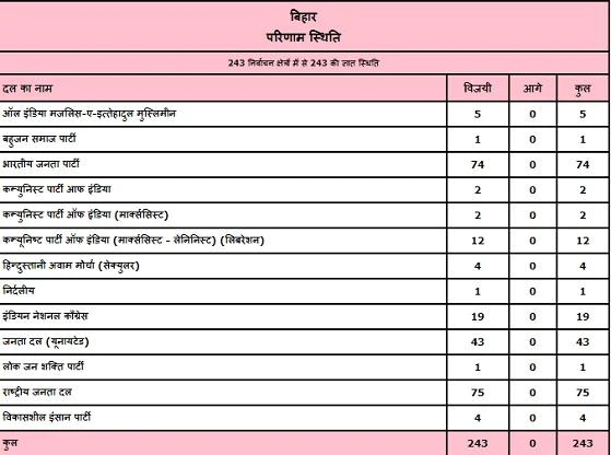 यह बहुमत के लिए जरूरी 122 के जादुई आंकड़े से तीन अधिक है। आरजेडी की अगुवाई वाले विपक्षी महागठबंधन को 110 सीटों पर जीत मिली है। एनडीए के घटक दलों में नीतीश कुमार की पार्टी जनता दल यूनाइटेड (जेडीयू) को 43 सीटों पर जीत मिली है. वहीं, 74 सीटों पर जेडीयू की गठबंधन सहयोगी बीजेपी के उम्मीदवार विजयी रहे हैं। एनडीए के अन्य घटक हिंदुस्तानी अवाम मोर्चा (हम) को चार और विकासशील इंसान पार्टी (वीआईपी) को चार सीटों पर विजयश्री मिली है।