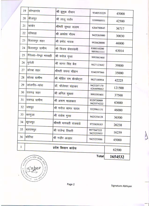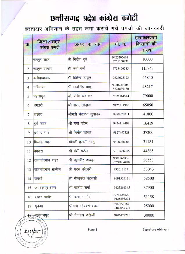 प्रदेश कांग्रेस के प्रभारी महामंत्री चंद्रशेखर शुक्ला ने कांग्रेस के छत्तीसगढ़ प्रभारी पी.एल. पुनिया को किसान, खेत, मजदूर, मंडी समितियों, पशुधन बाजार समितियों में राज्य में करवाये गये हस्ताक्षरों की जिलेवार रिपोर्ट सौंपा है। कांग्रेस ने प्रदेश में मोदी सरकार के काले कानूनों के खिलाफ पूरे प्रदेश में हस्ताक्षर अभियान के साथ धरना, प्रदर्शन, जनजागरण अभियान एक माह तक चलाया था। कांग्रेस कार्यकर्ताओं ने राज्य के सभी ब्लाकों एवं जिलों में जनता को कृषि कानून से होने वाले नुकसान तथा देश की खेती को पूंजीपतियों का सौपने के षड़यंत्रों को बेनकाब किया गया। जनजागरण और हस्ताक्षर अभियान के दौरान किसानों में केन्द्र के कृषि कानूनों के खिलाफ आक्रोश स्पष्ट दिख रहा था लोगों का मानना है मोदी सरकार ने कृषि कानून बना कर किसानों और खेती की कमर तोड़ दिया।