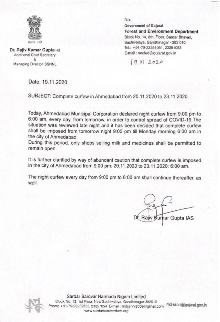गुजरात के आईएएस अफसर डॉ. राजीव कुमार गुप्ता ने ट्वीट करके बताया था कि देर रात कोरोना स्थिति की समीक्षा की गई और यह निर्णय लिया गया कि पूर्ण कर्फ्यू आज रात 9:00 बजे से सोमवार सुबह 6:00 बजे तक अहमदाबाद शहर में लगाया जाएगा। इस अवधि के दौरान केवल दूध और दवाइयां बेचने वाली दुकानों को खुला रहने दिया जाएगा।