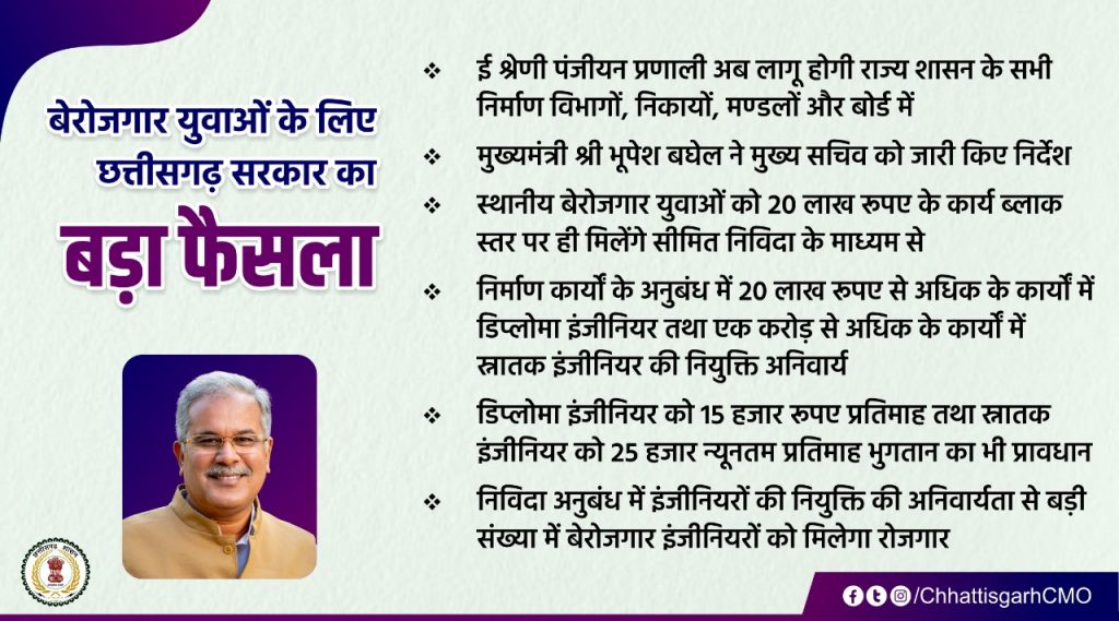 रायपुर 30 नवंबर 2020। छत्तीसगढ़ के बेरोजगार युवाओं को स्वरोजगार से जोड़ने के लिए मुख्यमंत्री भूपेश बघेल ने आज एक बड़ा फैसला लेते हुए राज्य सरकार द्वारा लोक निर्माण विभाग में लागू की गई ”ई” श्रेणी पंजीयन प्रणाली को अब राज्य शासन के सभी निर्माण विभागों, निकायों, मण्डलों और बोर्ड आदि में भी लागू करने के निर्देश दिए।