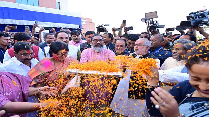 रांची 12 मार्च 2025। झारखंड विधानसभा में बजट सत्र जारी है। इस दौरान मंगलवार को विधानसभा परिसर फगुआ गीत से गूंज उठा। दरअसल, राज्य के मुख्यमंत्री हेमंत सोरेन एवं विधानसभा के अन्य सदस्य होली को लेकर उत्साहित नजर आए। होली मिलन पर मुख्यमंत्री ने तमाम विधानसभा के सदस्यों को अबीर गुलाल लगाकर होली की बधाई दी। पार्टी लाइन से उठकर तमाम राजनीतिक दलों के नेता होली मिलन में एकत्रित हुए।