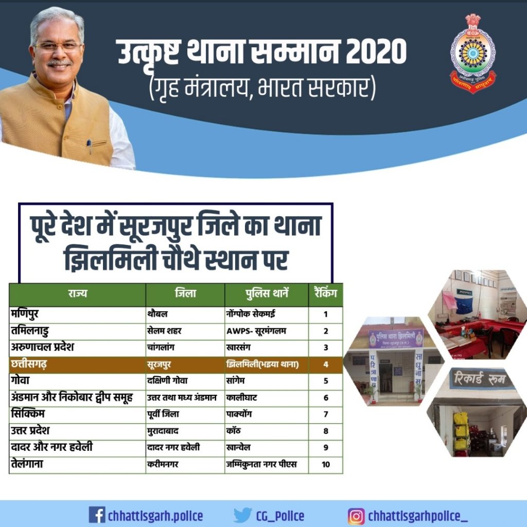 रायपुर 03 दिसम्बर 2020। मुख्यमंत्री भूपेश बघेल ने गृह मंत्रालय भारत सरकार द्वारा वर्ष 2020 के ’उत्कृष्ट थाना सम्मान’ में सूरजपुर जिले के झिलमिली थाने को देश में चौथा स्थान मिलने पर झिलमिली थाने के अधिकारियों-कर्मचारियों सहित पुलिस विभाग को बधाई और शुभकामनाएं दी हैं। मुख्यमंत्री ने कहा है कि छत्तीसगढ़ के सूरजपुर जिले के झिलमिली थाने को उत्कृष्टता के मामले में देश में चौथा स्थान मिलना हम सब के लिए गर्व का विषय है।