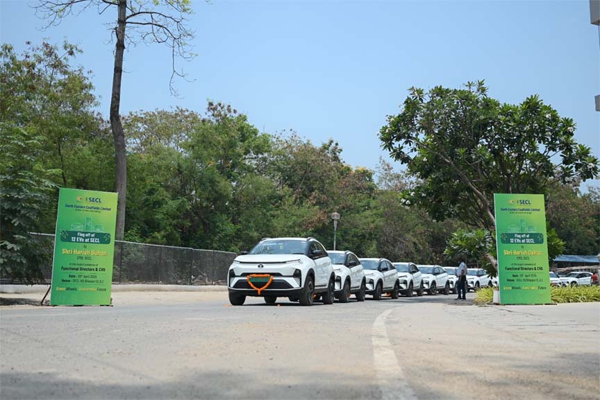 बिलासपुर 27 अप्रैल 2025। साउथ ईस्टर्न कोलफील्ड्स लिमिटेड (एसईसीएल) मुख्यालय के रोड परिवहन बेड़े में आज 12 नए इलेक्ट्रिक वाहन (ईवी) शामिल किए गए । इस हेतु मुख्यालय बिलासपुर में आयोजित समारोह में आज एसईसीएल सीएमडी हरीश दुहन द्वारा, एन. फ्रैंकलिन जयकुमार निदेशक तकनीकी (संचालन सह योजना/परियोजना) एवं हिमांशु जैन, मुख्य सतर्कता अधिकारी विभागाध्यक्षों, अधिकारी- कर्मचारी की उपस्थिति में हरी झंडी दिखाकर रवाना किया गया। इन इलेक्ट्रिक वाहनों को तीन वर्षों की अवधि के लिए किराए पर लिया गया है और इन्हें एसईसीएल मुख्यालय में तैनात किया जाएगा। यह पहल एसईसीएल द्वारा अपने मुख्यालय एवं परिचालन क्षेत्रों में ऊर्जा दक्षता को बढ़ावा देने के लिए चलाए जा रहे अभियानों का एक महत्वपूर्ण हिस्सा है।