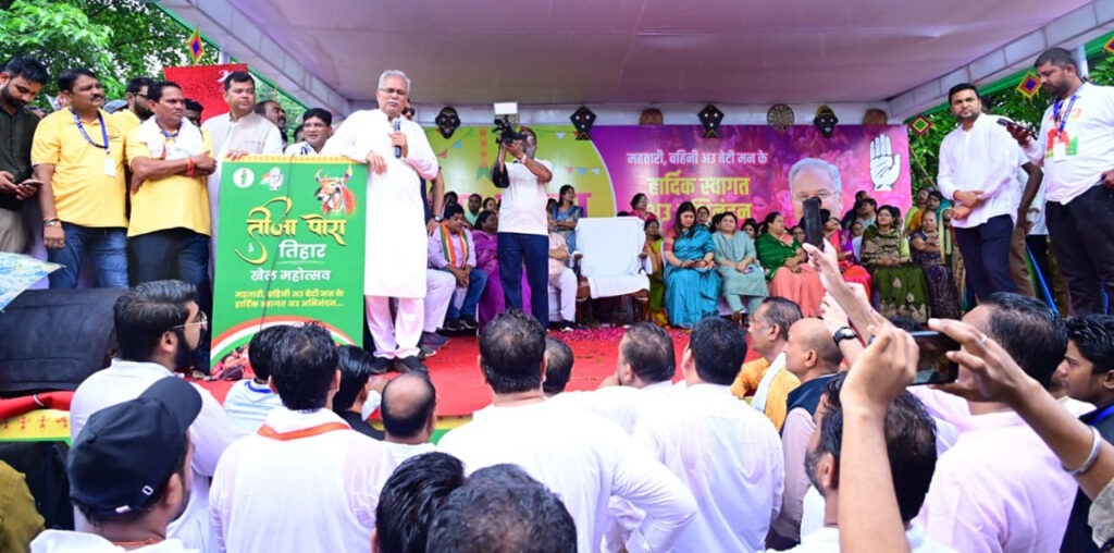 रायपुर 24 अगस्त 2025। कांग्रेस के राष्ट्रीय महासचिव एवं पूर्व मुख्यमंत्री भूपेश बघेल के द्वारा प्रतिवर्षानुसार इस वर्ष भी तीजा-पोरा महोत्सव का आयोजन किया गया। इस वर्ष का आयोजन सुभाष स्टेडियम में किया गया, जिसमें प्रदेश के सभी जिलों से बड़ी संख्या में बहनें तीजा महोत्सव में शामिल होने पहुंची थी। महिला कांग्रेस की पूर्व राष्ट्रीय अध्यक्ष और अखिल भारतीय कांग्रेस कमेटी की सचिव नेट्टा डिसूजा और कांग्रेस की राष्ट्रीय प्रवक्ता श्रीमती रागिनी नायक भी तीजा महोत्सव में शामिल होने आई थी। कार्यक्रम में बड़ी संख्या में विधायक गण, कांग्रेस के पदाधिकारी और नेता गण तथा कार्यकर्ता भी शामिल हुए। तीजा महोत्सव के साथ 23 अगस्त को श्री भूपेश बघेल का जन्मदिन भी होने के कारण प्रदेश भर से कांग्रेसजन और आम लोग बधाई और शुभकामना देने पहुंचे थे।