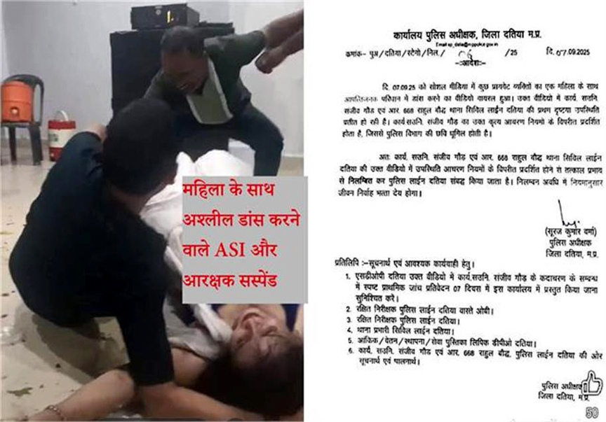 दतिया 08 सितंबर 2025। जिले में पुलिस महकमे की छवि धूमिल करने वाले दो पुलिसकर्मियों पर गाज गिरी है। पुलिस अधीक्षक सूरज वर्मा ने ASI संजीव गौड़ और आरक्षक राहुल बौद्ध को तत्काल प्रभाव से सस्पेंड कर दिया है।
