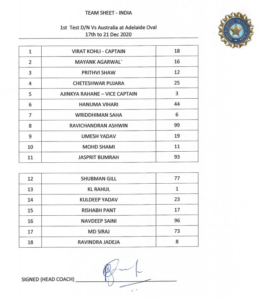 विराट कोहली (कप्तान), मयंक अग्रवाल, पृथ्वी शाॅ, चेतेश्वर पुजारा, हनुमा विहारी, अजिंक्य रहाणे, ऋद्धिमान साहा, रविचंद्रन अश्विन, उमेश यादव, मोहम्मद शमी और जसप्रीत बुमराह।