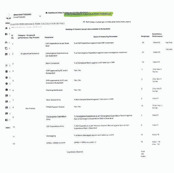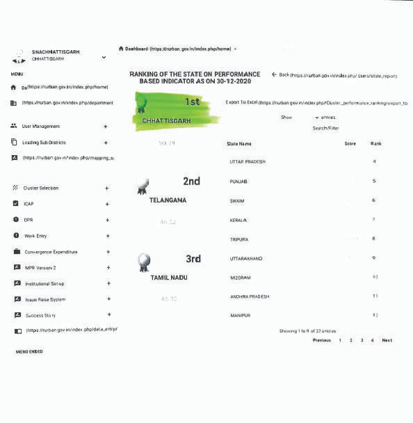 यहां यह उल्लेखनीय है कि भारत सरकार के ग्रामीण विकास मंत्रालय द्वारा रूर्बन मिशन अंतर्गत अब तक हुए वित्तीय एवं भौतिक प्रगति का आंकलन कुल 12 संकेतकों के आधार पर करते हुए देश के समस्त रूर्बन कलस्टरों की ’’डायनमिक रैंकिंग प्रणाली’’, को मिशन अंतर्गत तैयार किए गए वेब पोर्टल द्वारा प्रारंभ की गई है। देश के विभिन्न राज्यों को आबंटित क्लस्टर के समेकित प्रदर्शन के आधार पर राज्योें की रैंकिंग की गई है। उक्त मानकों के आधार पर की गई रैंकिंग के अनुसार छत्तीसगढ़ राज्य उत्कृष्ठ प्रदर्शन करने वाले राज्यों की सूची में पुनः प्रथम स्थान पर है।