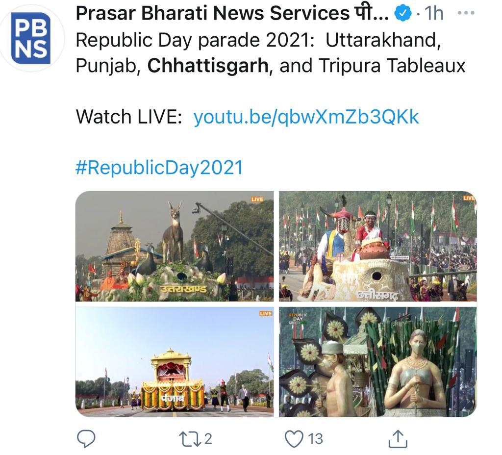 रायपुर 26 जनवरी 2021। देश के लोगों ने आज नई दिल्ली के राजपथ पर छत्तीसगढ़ के पारंपरिक वाद्य यंत्रों पर आधारित निकली झांकी को न केवल बड़ी उत्सुकता के साथ देखा बल्कि इसकी उन्मुक्त कंठो से सराहना भी की। यह झांकी नेशनल मीडिया के साथ ही लोगों के दिलो-दिमाग में छा गई। गणतंत्र दिवस पर नई दिल्ली में छत्तीसगढ़ के पारंपरिक वाद्य यंत्रों पर आधारित राज्य की झांकी देश भर के लोगों का आकर्षण का केन्द्र बनी वहीं यह सोशल मीडिया पर भी छायी रही। देश के विभिन्न हिस्सों से लगातार इसको सराहना मिल रही है।